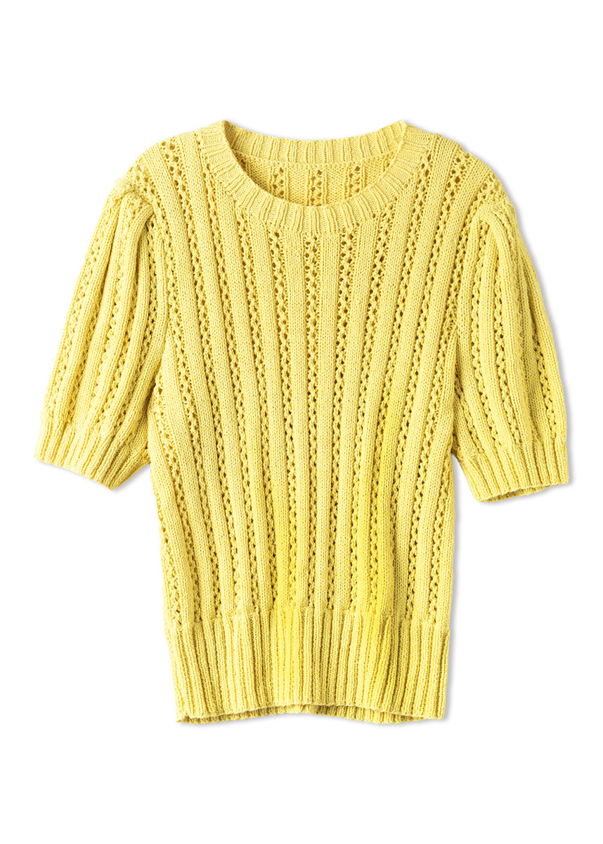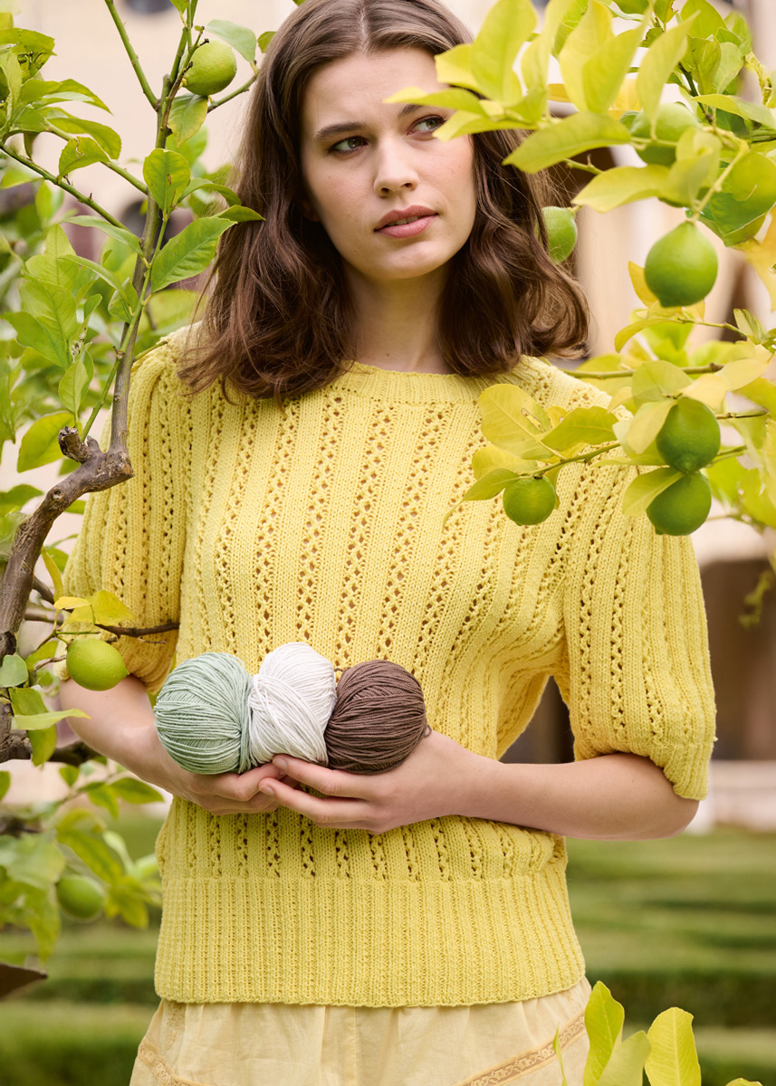 Material: Garn: Lana Grossa «Gioia» (75 % bomull, 25 % polyamid (resirkulert), LL = ca. 110 m/50 g): Ca. 550 (600 - 650 - 700) g vanilje (frg 3) Pinner: Nr. 3 og 4, kort rundpinne nr. 3, tre strømpepinner nr. 4