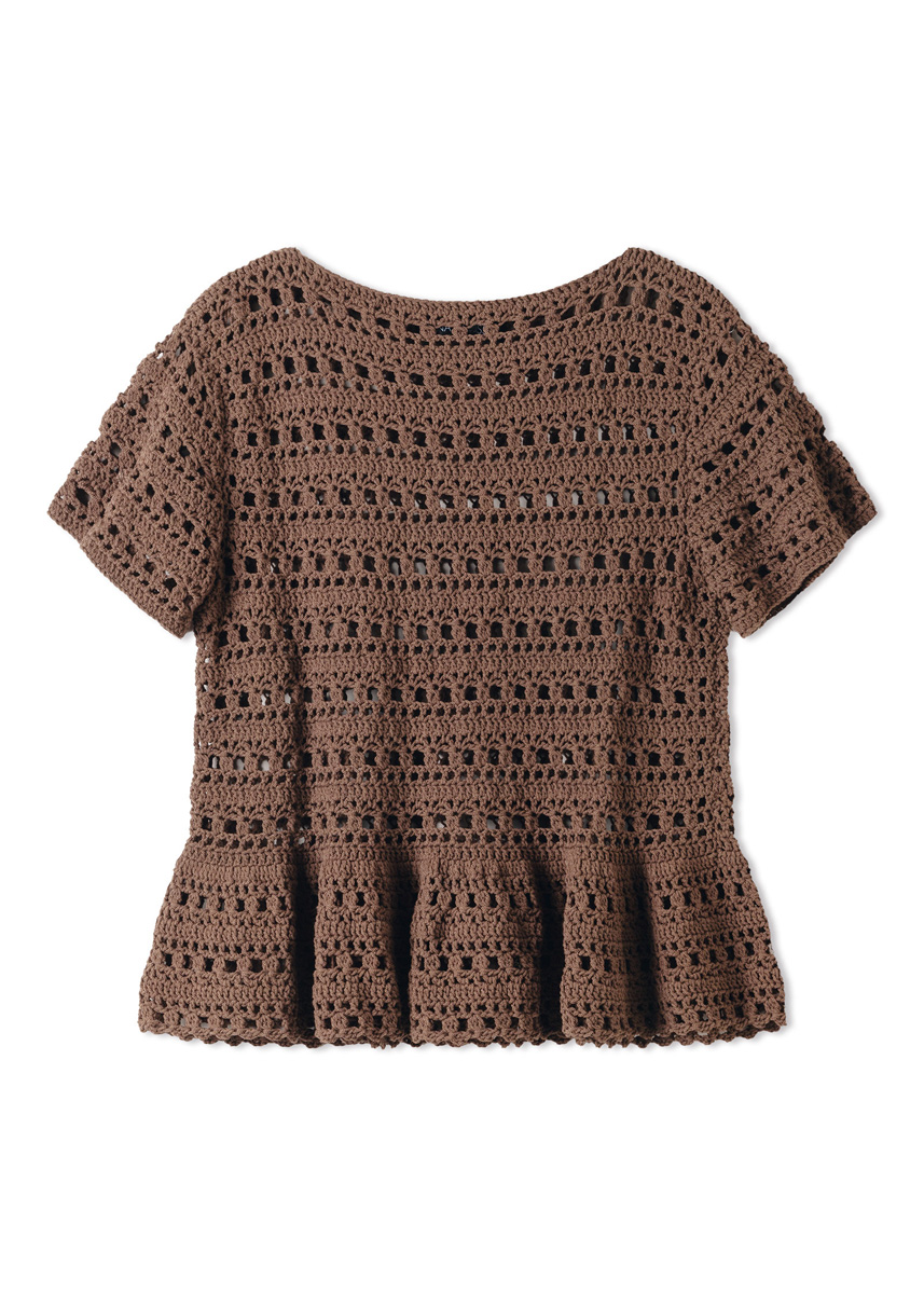 Lana Grossa-kvalitet ”Gioia” (75 % bomuld, 25 % polyamid (genanvendt), løbelængde ca. 110 m/50 g): ca. 450 (500 - 550 - 600) g mørkebrun (farve 17); hæklenål nr. 3½.