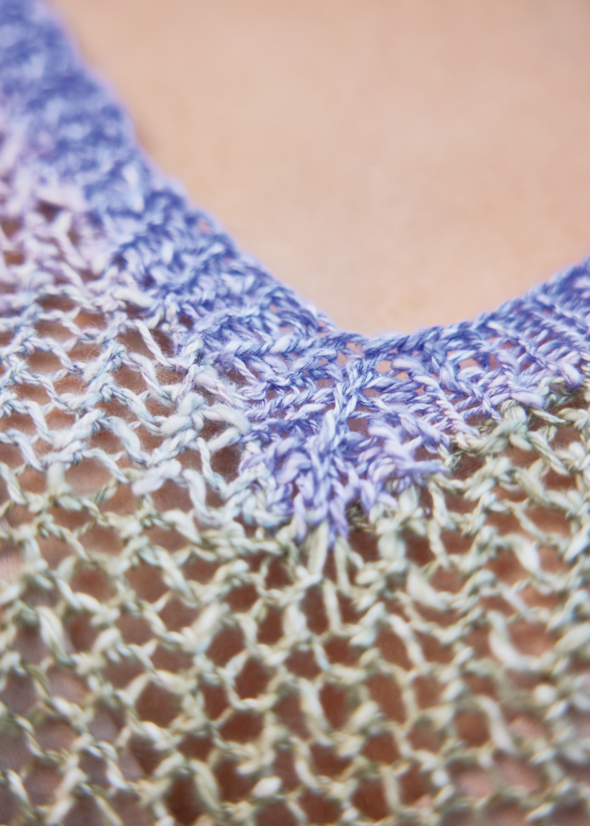 Lana Grossa-kvalitet „Gomitolo Collina“ (72 % bomull, 28 % viskos, löplängd = ca 260 m/100 g): 4 (4 - 4 - 5) nystan = ca 400 (400 - 400 - 500) g vanilj/rosa/antikviolett/grågrön/gråbrun/terrakotta (färg 1014); stickor nr. 3 och nr. 3,5; 1 kort rundsticka nr. 3.