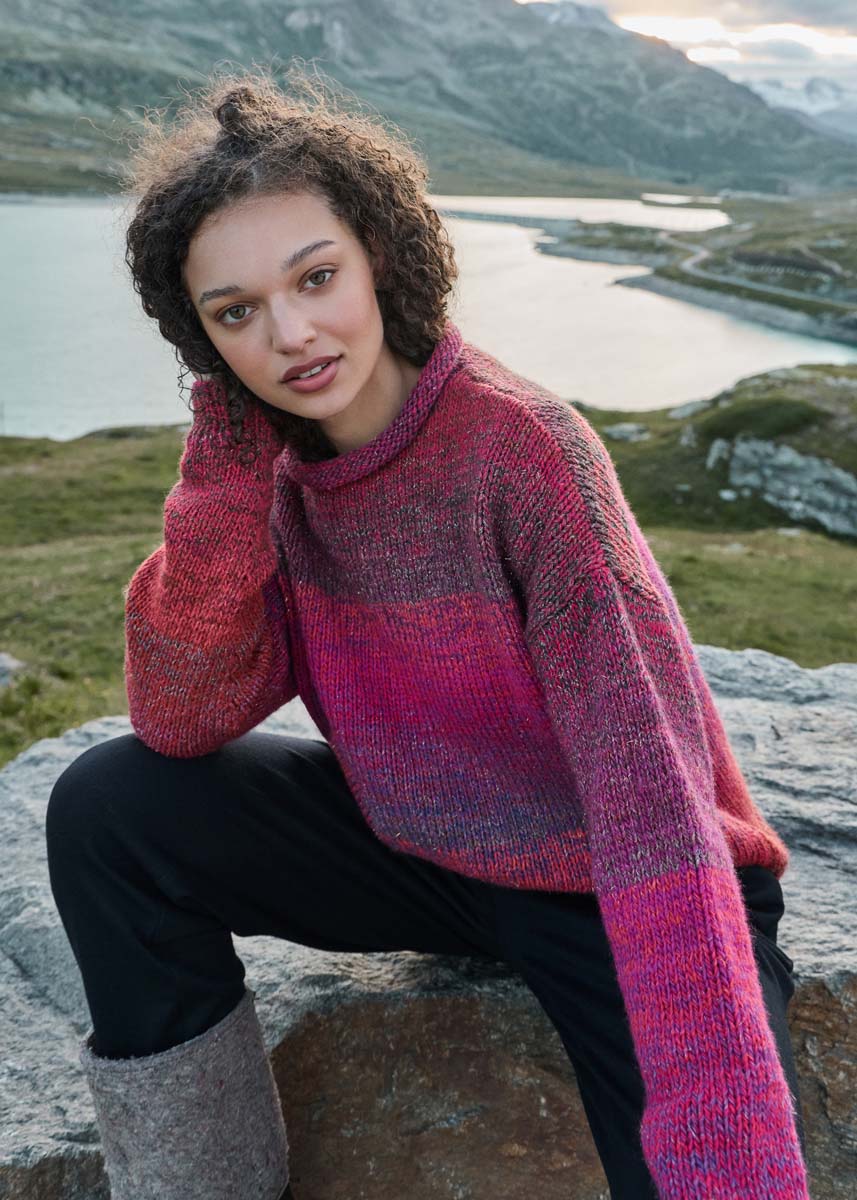 Lana Grossa-kvalitet „Gomitolo Gala“ (60 % ren ny ull, 38 % polyacryl, 2 % polyester, løpelengde = ca 700 m/200 g): 2 (2 - 2 - 2) nøster = ca 400 (400 - 400 - 400) g burgunder/ svartrød/rødfiolett/purpur/blåfiolett/mørkblå/rostrød/terrakotta (farge 4029) og 2 (2 - 2 - 2) nøster = ca 400 (400 - 400 - 400) g gråbrun/vinrød/mørkrød/kirsebærrød (farge 4031); strikkepinner nr. 5 og 6; kort rundpinne nr. 5.