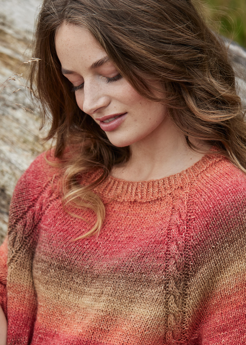 Lana Grossa-kvalitet „Gomitolo Versione“ (60 % ren ny ull, 40 % polyacryl, löplängd = ca 700 m/200 g): ca 200 (200 - 200) g röd/vinröd/gråbrun/taupe/kamel/ljus röd (färg 426); kortare och längre rundsticka nr. 3,5 och 4, strumpstickor nr. 3,5 och 4, flätsticka