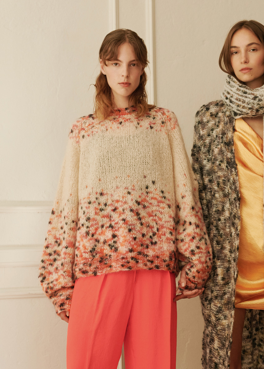 Lana Grossa-kvalitet „Lala Berlin Brushy“ (42 % mohair (superkid), 38 % ren ny ull (merino), 20 % polyamid, löplängd 135 m/50 g): ca. 200 g rosa/orange/korall/vinröd/svartbrun (färg 101) och ca. 250 g beige (färg 7); stickor nr. 5 och 6, 1 rundsticka nr. 5, 50 cm lång.