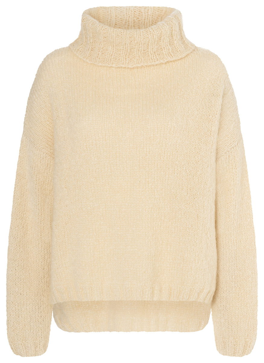 Lana Grossa-kvalitet „Lala Berlin Brushy“ (42 % mohair (superkid), 38 % ren ny ull (merino), 20 % polyamid, löplängd 135 m/50 g): ca. 350 (400 – 450 – 500) g beige (färg 7) eller giftgrön (färg 4); stickor nr. 5 och 6, 1 rundsticka nr. 5, 50 cm lång.