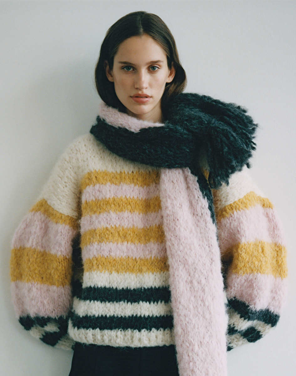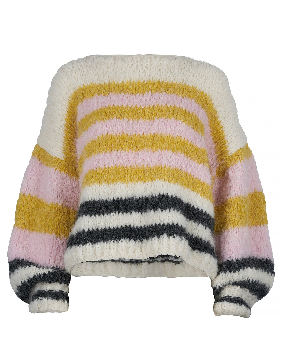 Lana Grossa-kvalitet ”Lala Berlin Furry” (90 % (baby) alpaka, 10 % polyamid, løbelængde = 94 ca. 75 m / 50 gr.): ca. 150(200) gr råhvid (fv 1) og 100 gr antracit (fv 10), pastelrosa (fv 12) og gul (fv 3), strikkepinde nr. 8 og 12, rundpind nr. 8, 50 cm