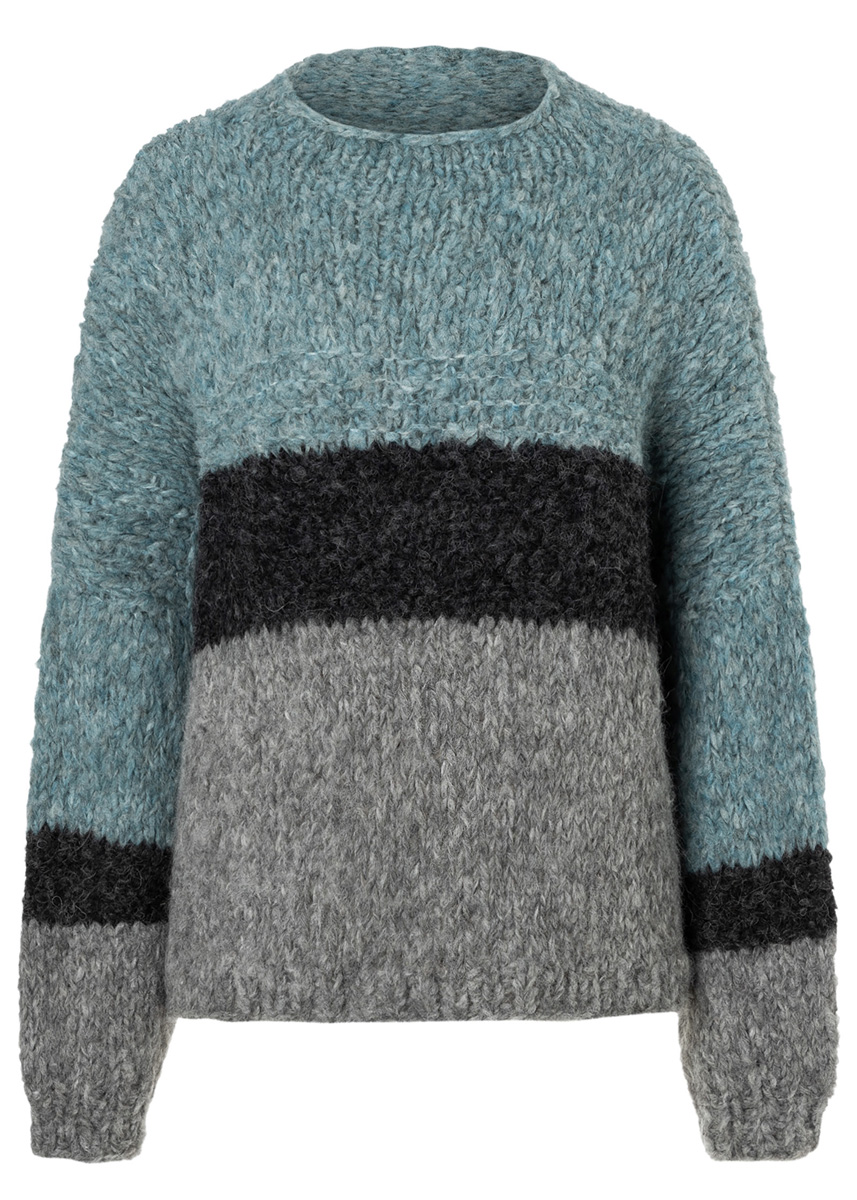 Lana Grossa ”Lala Berlin Furry” (90 % alpaka, 10 % polyamid, løbelængde 75 m / 50 gr), 150(200-250) gr grå (fv 11), 150(200-250) gr gråblå (fv 14) og 100(150-150) gr antracit (fv 10), strikkepinde nr. 8 og 9, rundpind nr. 8, 40 cm.