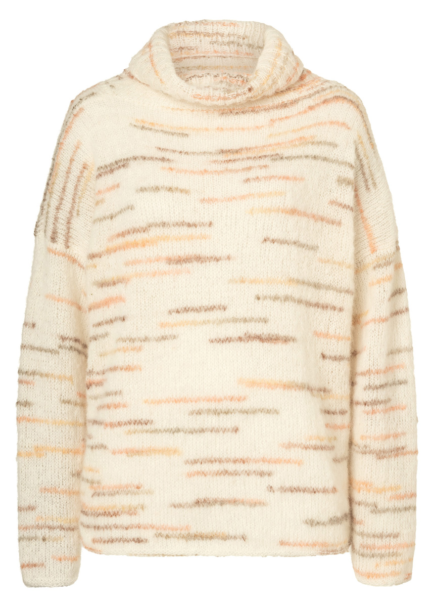 Lana Grossa „Lala Berlin Hazy“ (40% alpacka (baby), 25% ren ny ull (merino superfine), 25% polyamid, 6% Tencel, 4% bomull, löplängd 250 m/50 g), 250 (300 – 300) g råvit/orange (färg 7); stickor nr. 3,5 och 4, 1 rundsticka nr. 3,5, 40 cm lång.