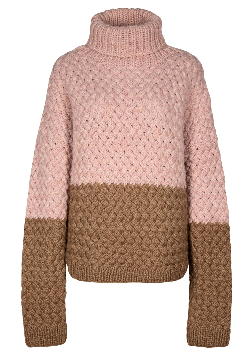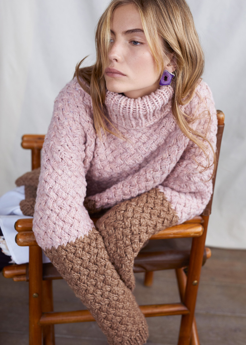 Lana Grossa-kvalitet ”Lala Berlin Lovely Cotton” (75 % ren ny uld (superfin merino), 25 % bomuld, løbelængde = ca. 75 m / 50 gr.): 500(550-600) gr rosa (fv 6) og 250 gr nougat (fv 4) eller som på model 29 750(800-850) gr lysegrå (fv 5), strikkepinde nr. 7 og 10, rundpind nr. 7, 40 cm, 1 snoningspind.
