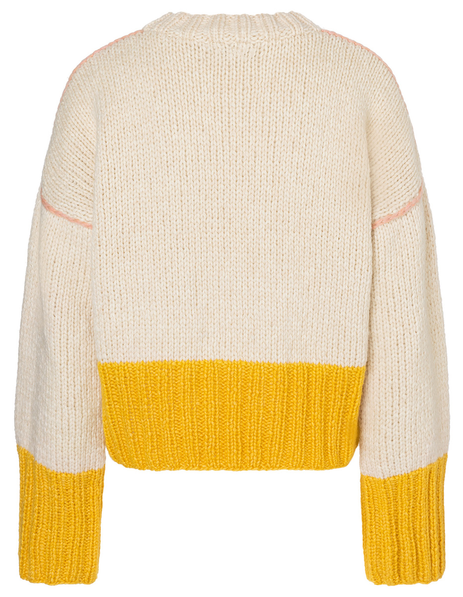 Lana Grossa-kvalitet „Lala Berlin Lovely Cotton” (75 % ren ny ull (Merino superfine), 25 % bomull, löplängd = ca. 90 m/50 g): ca. 450 (500) g natur (färg 7), ca. 150 (200) g gul (färg 15) och ca. 50 g lax (färg 26); stickor nr. 6 och 8, rundsticka nr. 6, 50 cm lång, 1 ullnål [synål] nr. 6.