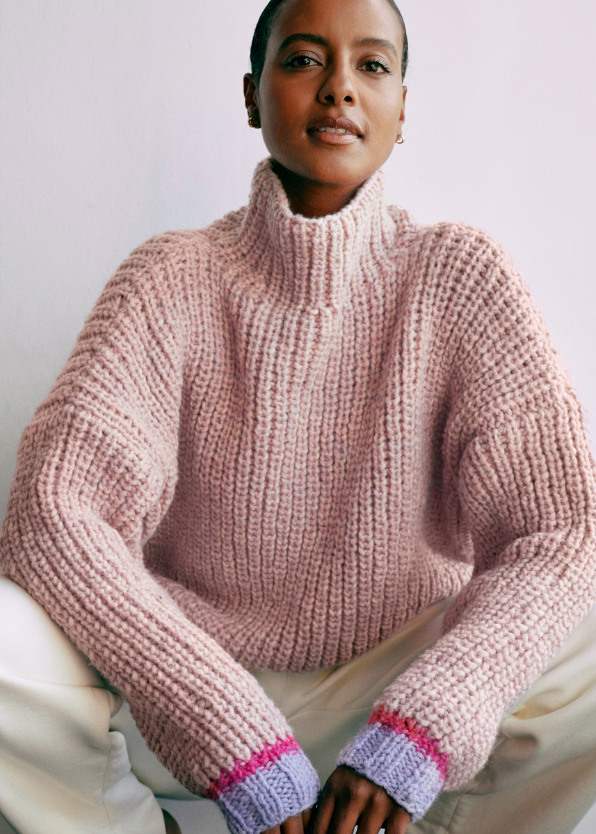 Lana Grossa-kvalitet „Lala Berlin Lovely Cotton“ (75 % ren ny ull (merino superfin), 25 % bomull, löplängd = ca. 90 m/50 g): ca. 650 (700 - 750 - 800) g rosa (färg 6), ca. 50 (100 - 100 - 100) g syren (färg 29) och ca. 50 (50 - 50 - 50) g pink (färg 28); stickor nr. 6 och 6,5; 1 rundsticka nr. 6.
