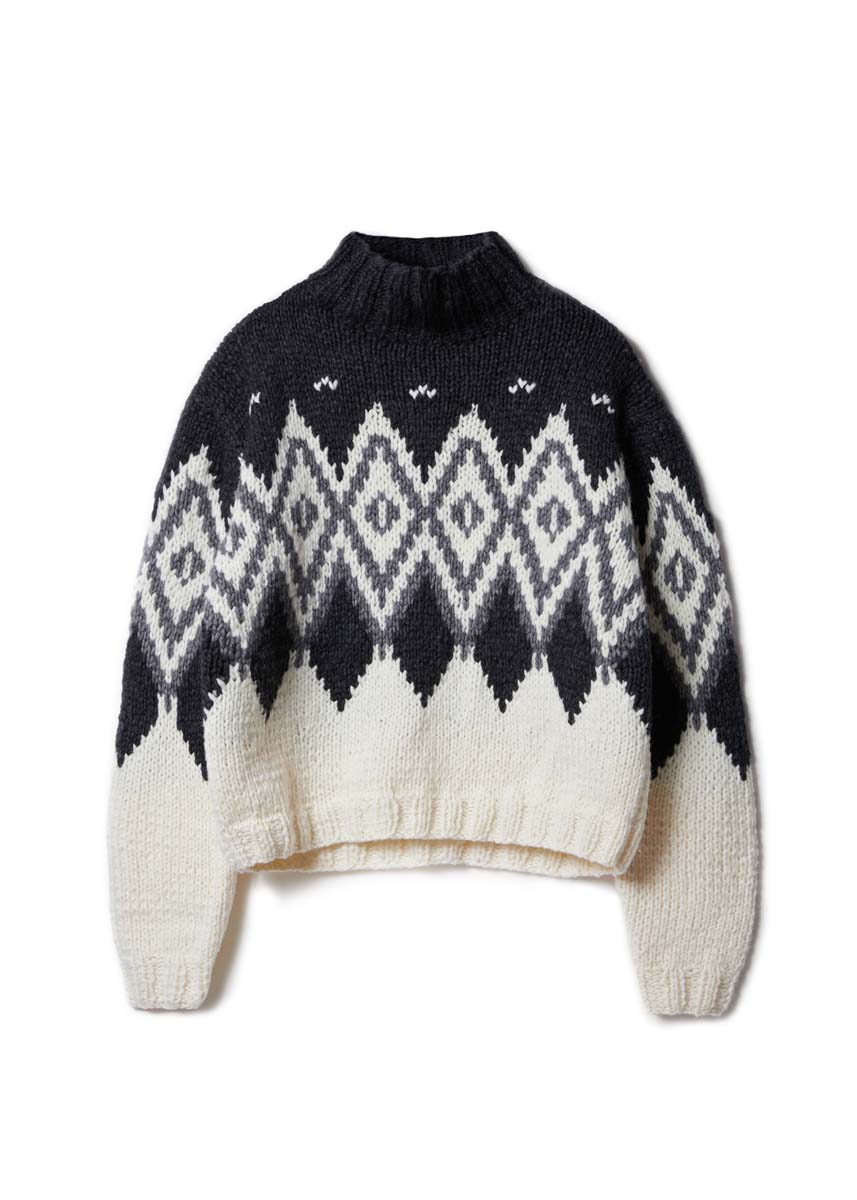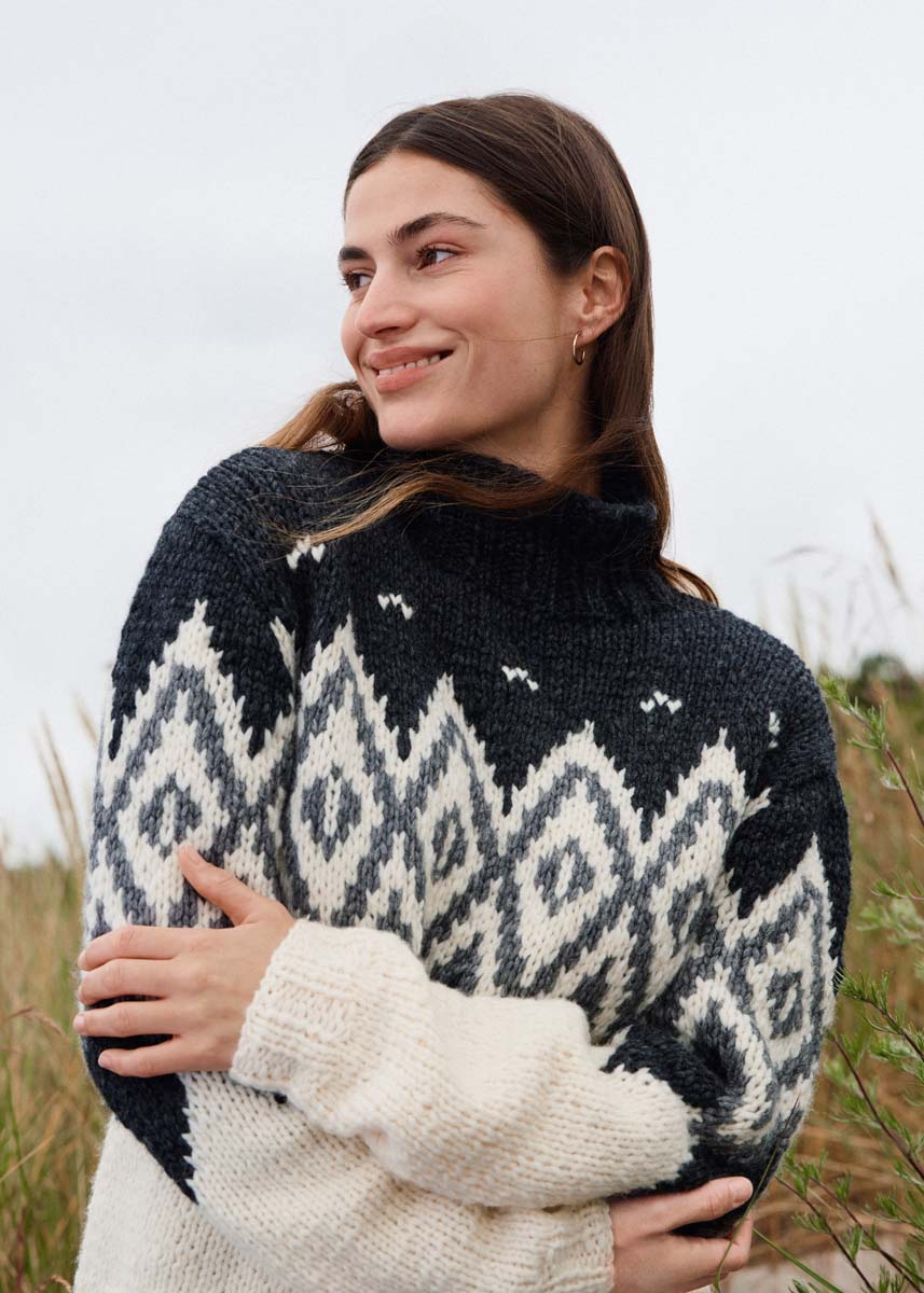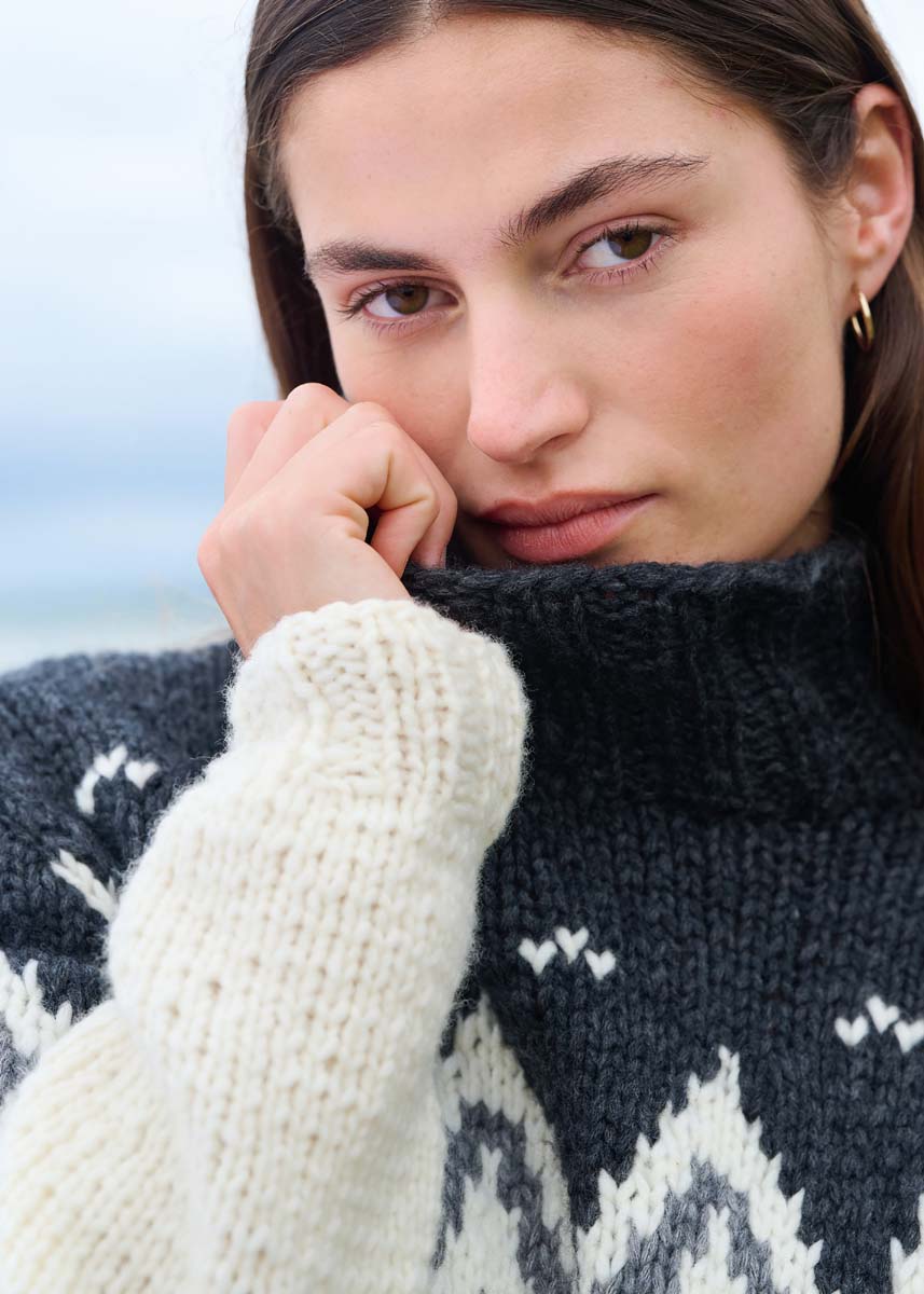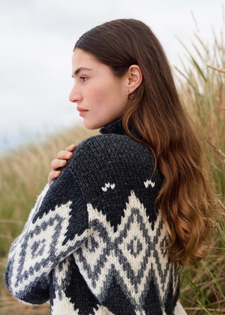 Lana Grossa-kvalitet „Lala Berlin Lovely Cotton” (75 % ren ny ull (superfin merino), 25 % bomull, löplängd = ca. 90 m/50 g): ca. 300 g råvit (färg 33), ca. 200 g Anthracit (färg 8) och ca. 150 g mörkgrå (färg 19); stickor nr. 5,5, 6,5 och 7, 1 rundsticka nr. 6, 40 cm lång, 1 ullnål från Lana Grossa zum Sticken.