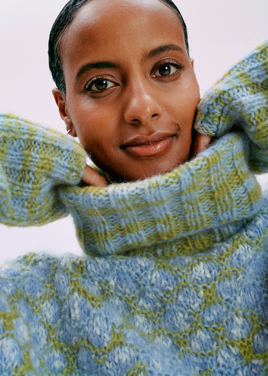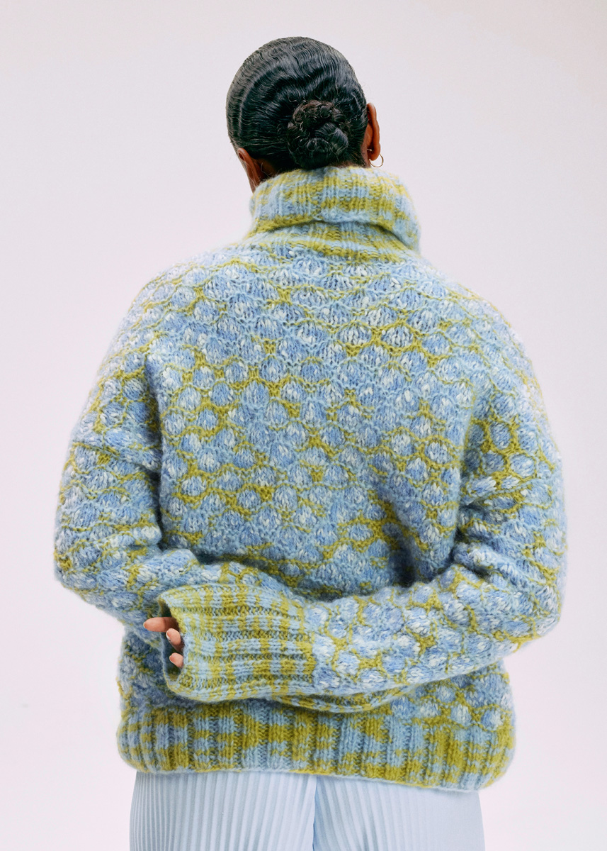 Lana Grossa-kvalitet „Lala Berlin Smoothy“ (62 % alpacka (baby), 27 % polyamid, 11 % ren ny ull (merino fin), löplängd = ca. 135 m/50 g): ca. 250 (300 - 300 - 350) g gulgrön/ljus blå (färg 7); Lana Grossa-kvalitet „Lala Berlin Buffy“ (47 % alpacka (baby), 30 % bomull, 23 % polyamid, löplängd = ca. 225 m/50 g): ca. 300 (350 -350 - 400) g ljusblå/råvit (färg 6); stickor nr. 6. Pullovern stickas med 1 tråd i Lala Berlin Smoothy och med dubbla trådar i Lala Berlin Buffy.