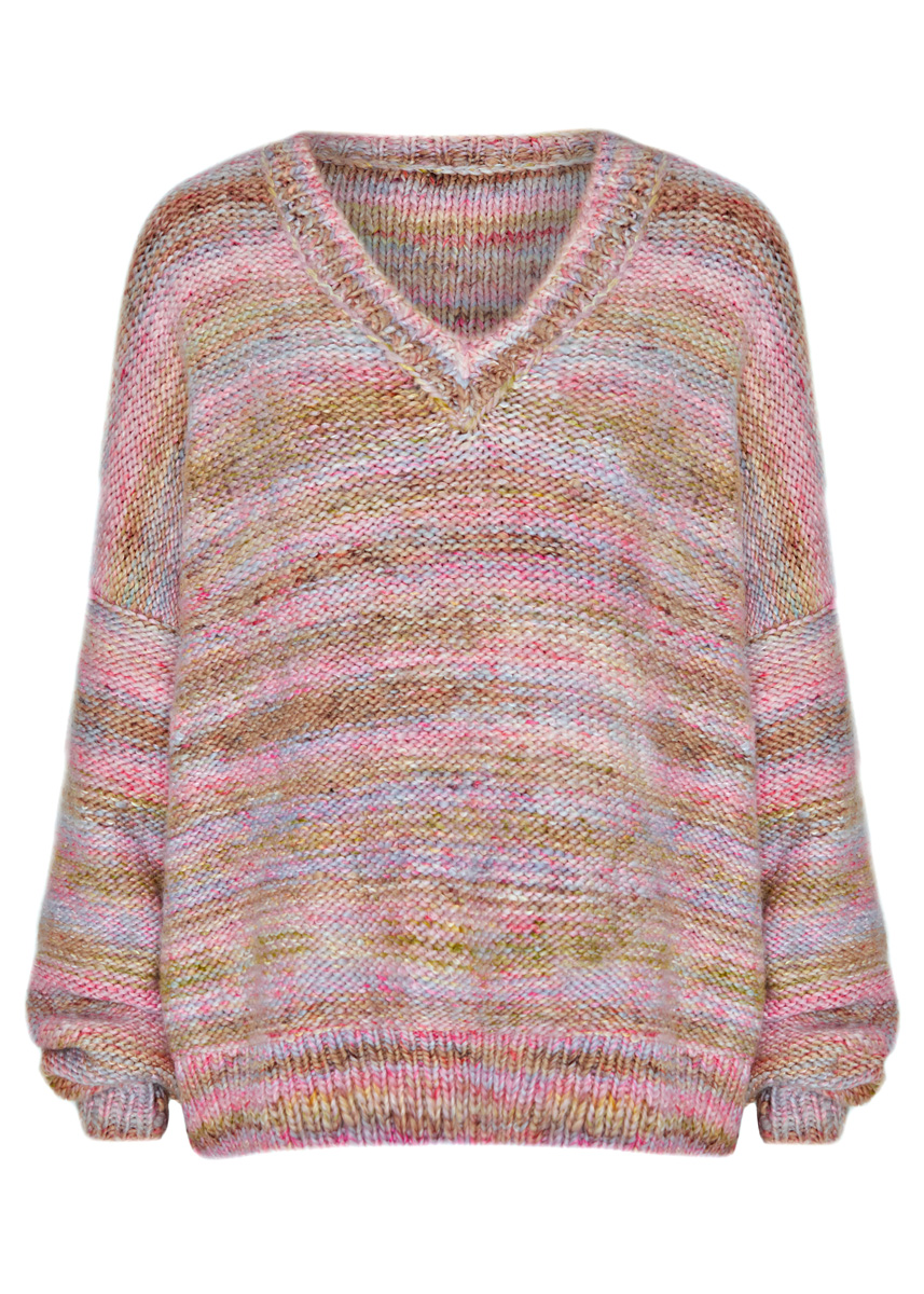 Lana Grossa-kvalitet „Lala Berlin Stripy“ (56 % ren ny ull (merino), 29 % polyacryl, 14 % (baby) alpacka, 1 % elastan, löplängd 90 m/50 g): ca. 650 (700) g rosa/lysande grön/beige/natur/syren/ljus grå (färg 10); stickor nr. 7 och 8, 1 rundsticka nr. 7, 60 cm lång, 1 ullnål från Lana Grossa.