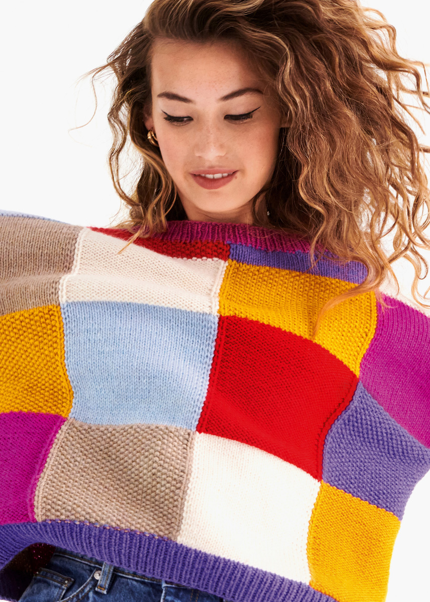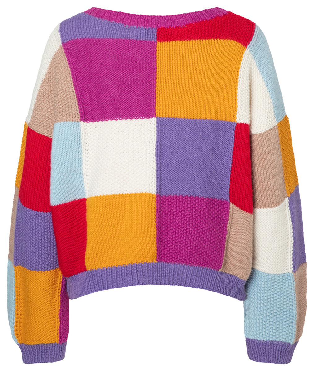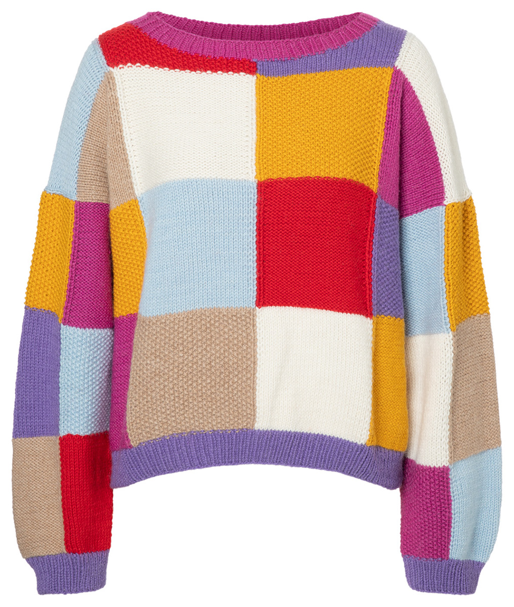Lana Grossa-kvalitet „Landlust alpacka Merino 100” (50 % ren ny ull (merino), 50 % (baby) alpacka, löplängd = ca. 100 m/50 g): ca. 150 g var i gul (färg 322) och violett (färg 316) och ca. 100 g var i pink (färg 314), röd (färg 319), kamel (färg 303), råvit (färg 301) och ljus blå (färg 318); stickor nr. 3 och 4,5, 1 rundsticka nr. 3, 50 cm lång.