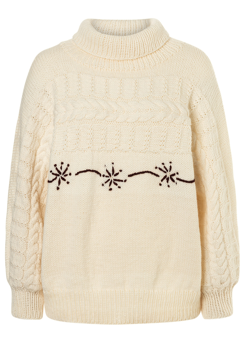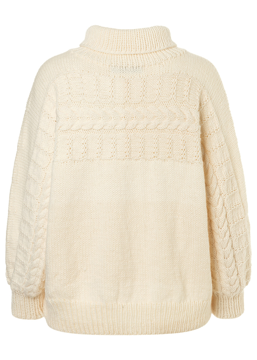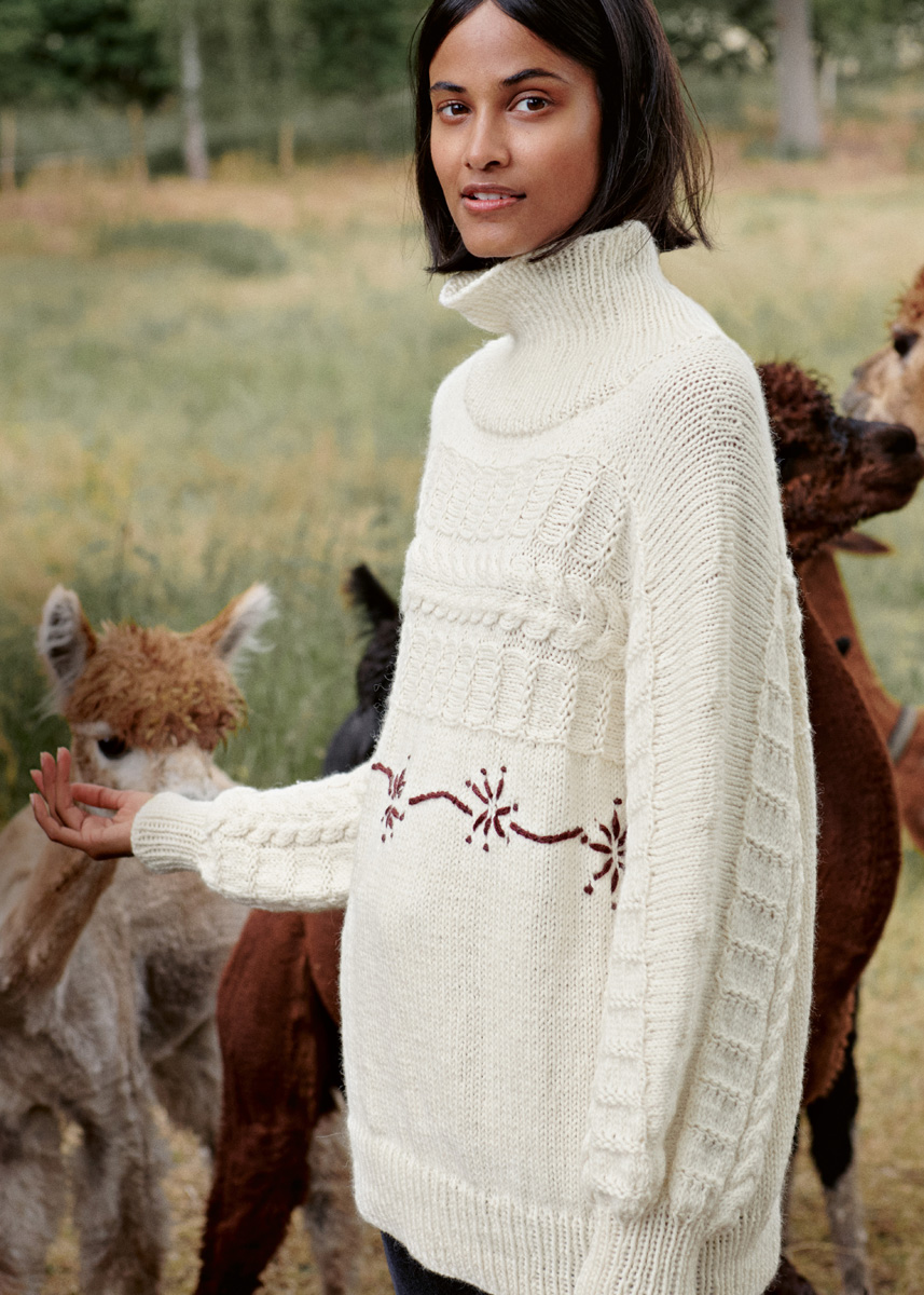 Lana Grossa-kvalitet „Landlust alpacka Merino 100” (50 % (baby) alpacka, 50 % ren ny ull (merino), löplängd = ca. 100 m/50 g): ca. 650 g råvit (färg 301) och 50 g burgund (färg 315); 2 rundstickor nr. 6, 100 cm långa, 1 rundsticka nr. 6, 50 cm lång, strumpstickor nr. 5, 1 hjälp- eller flätsticka.