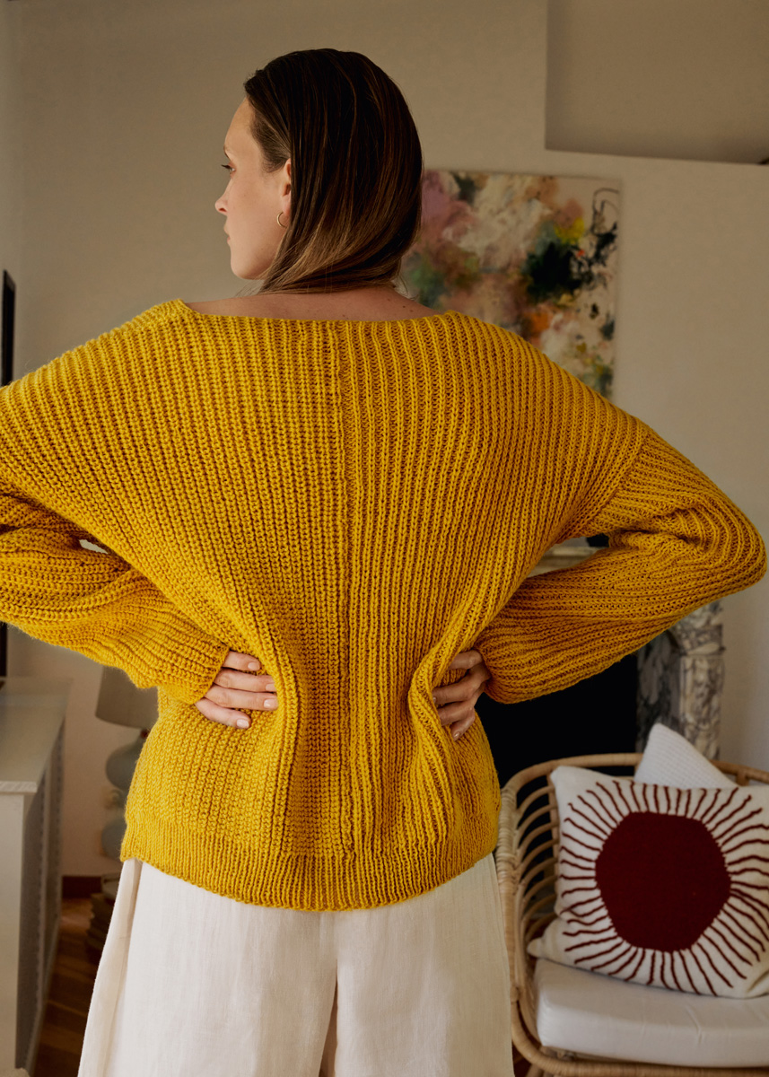 Lana Grossa-kvalitet „Landlust Alpaka Merino 160” (50 % ren ny ull (merino), 50 % (baby) alpacka, löplängd = ca. 160 m/50 g): ca. 550 (600 – 650) g gul (färg 422); stickor nr. 3,5.