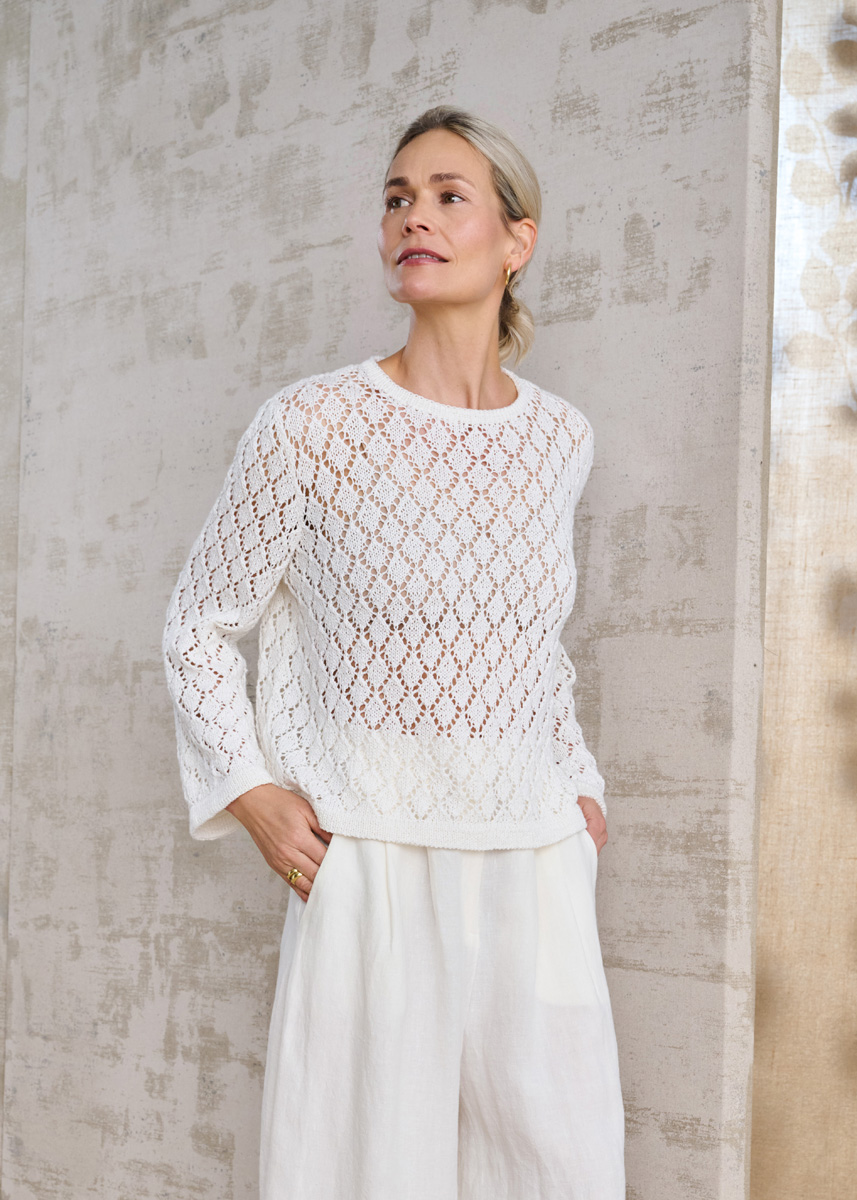 Lana Grossa-Kvalitet Landlust Sommerseide (50% silke, 50% bomuld, løbelængde 170 m/50 g), 300 (350 – 400) g hvid (farve 1); strikkepinde nr. 3½ og rundpind nr. 3, 40 cm lang, hjælpepind nr. 3½.