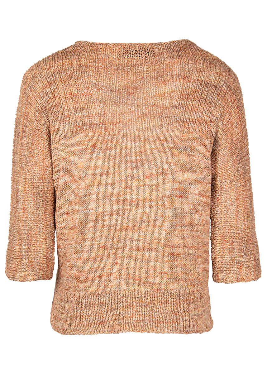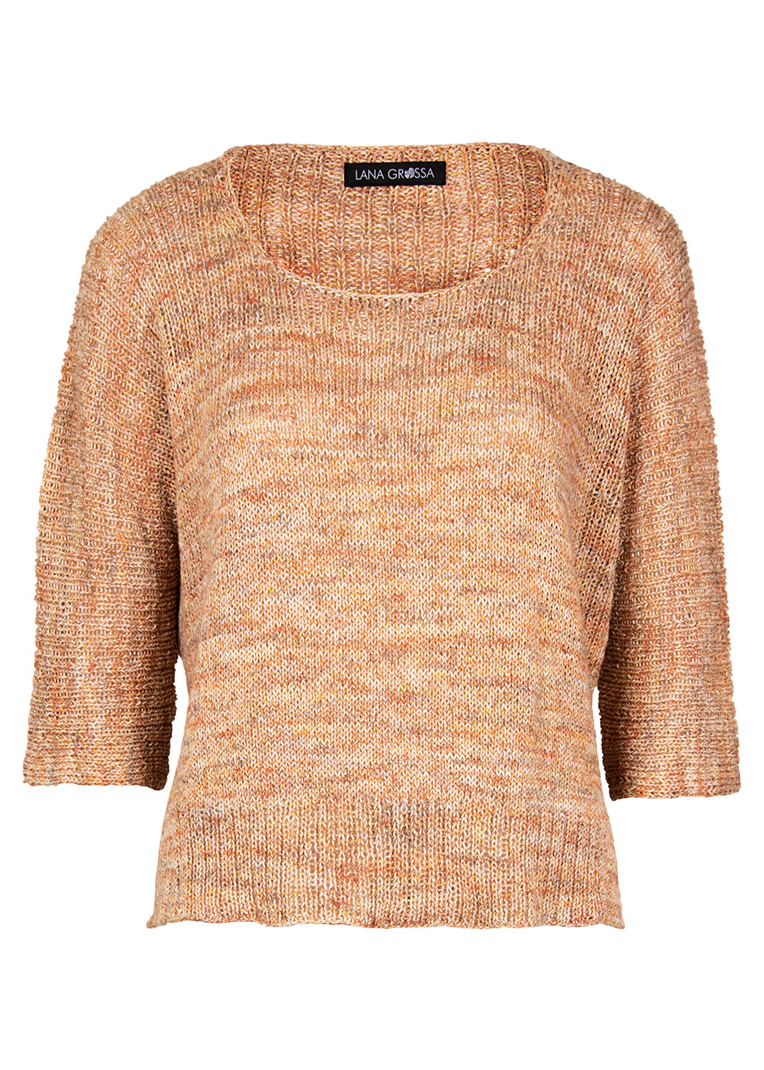 Lana Grossa-kvalitet „Landlust Sommerseide Mélange” (50 % silke, 50 % bomull, löplängd = ca. 170 m/50 g): ca. 300 (350 – 400) g orange melerat (färg 101); stickor nr. 3,5, 1 rundsticka nr. 3,5, 60 och 100 cm lång.