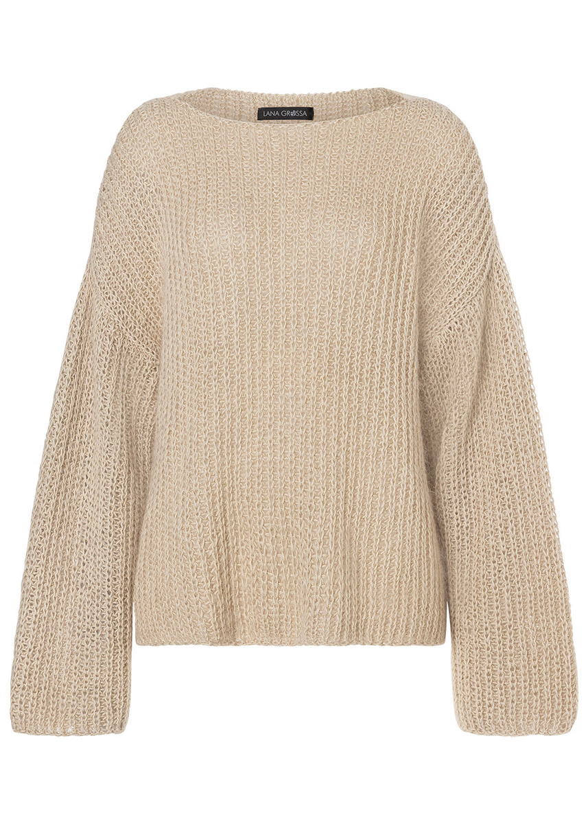 Lana Grossa Landlust Sommerseide (50% silke, 50% bomull, löplängd 170 m/50 g), 400 (450 – 500) g natur (färg 2) och Lana Grossa Silkhair (70% mohair, 30% silke, löplängd 210 m/25 g), 150 (175 – 200) g ljus beige (färg 18); stickor nr. 5,5 och 6.