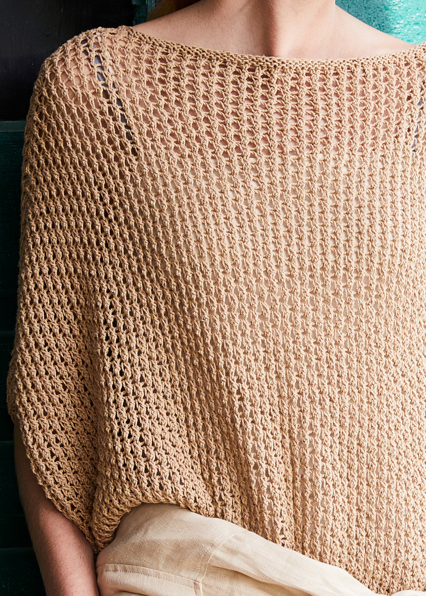 Lana Grossa-kvalitet „Landlust Sommerseide“ (50% silke, 50% bomull, löplängd ca. 170 m/50 g), 300 (350 - 350 - 400) g i kamel (färg 44); 1 rundsticka nr. 3,5, 80 cm lång.