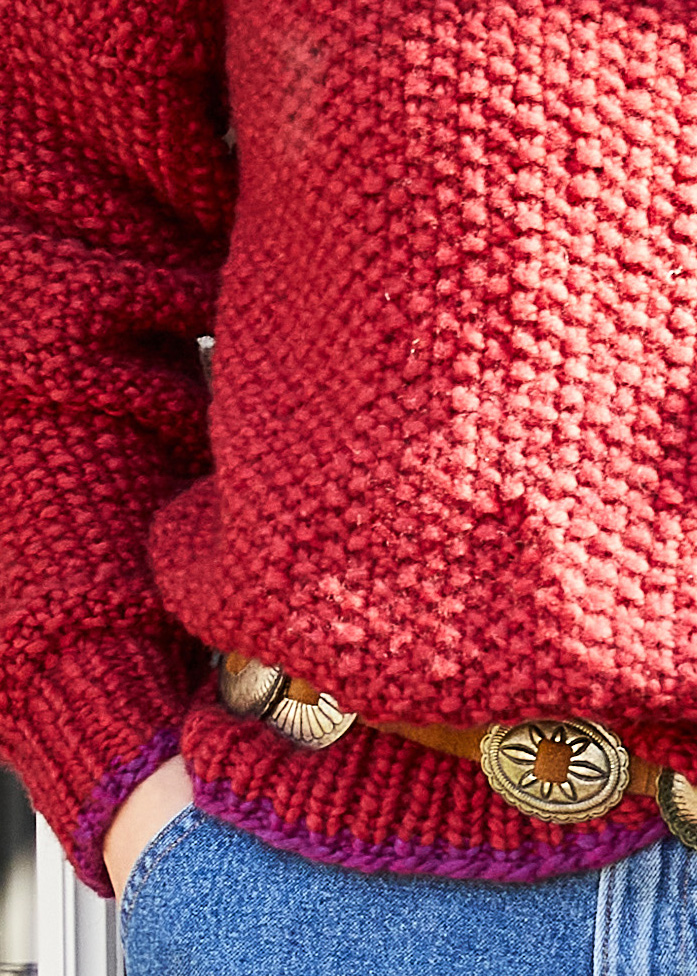 Lana Grossa-kvalitet „Land-lust-Winterwolle“ (50% renny ull merino, 35% bomull, 15% jak, löplängd ca. 70 m/50 g), till pullovern 500 (550 - 600 - 650) g i karminröd melerad (färg 4) och 50 g i fuchsia melerad (färg 6); t stickor nr. 6 och nr. 7, 1 rundsticka nr. 6, 50 cm lång.