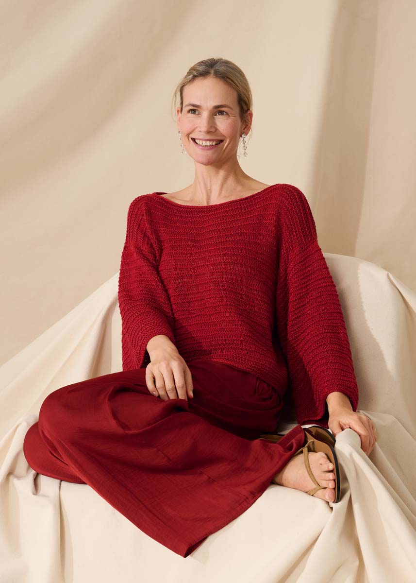Lana Grossa Linarte (40% viskose, 30% bomull, 20% lin, 10% polyamid, løpelenge 125 m/50 g), 450 (500 – 600 – 650) g mørkrød (farge 8); rundpinner nr. 4, 40 og 60 cm lang og 1 rundpinne nr. 3,5, 40 cm lang.