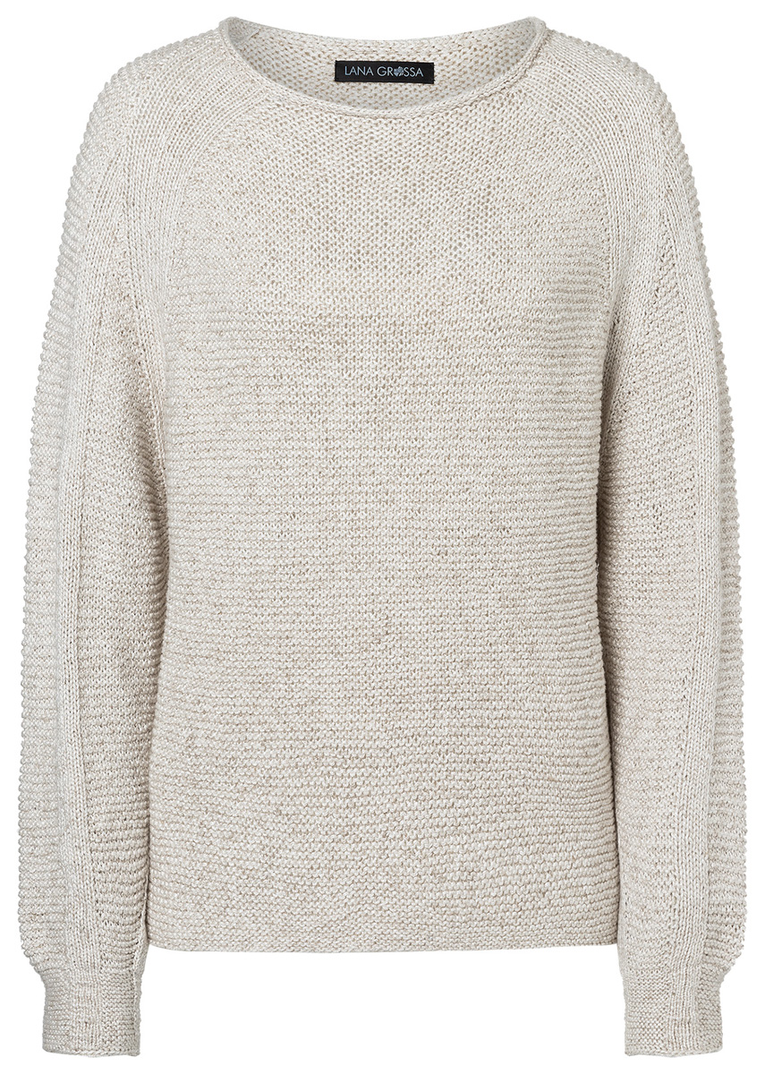 Lana Grossa Linarte (40% viskos, 30% bomull, 20% lin, 10% polyamid, löplängd 125 m/50 g), 550 (600 – 650) g ecru (färg 1); stickor nr. 2,5 och 4,5, 1 rundsticka nr. 3,5, 40 cm lång.