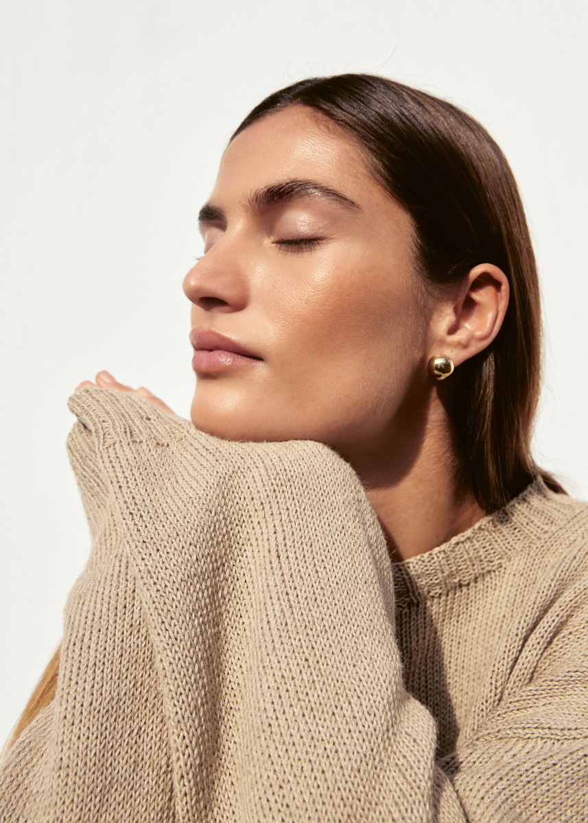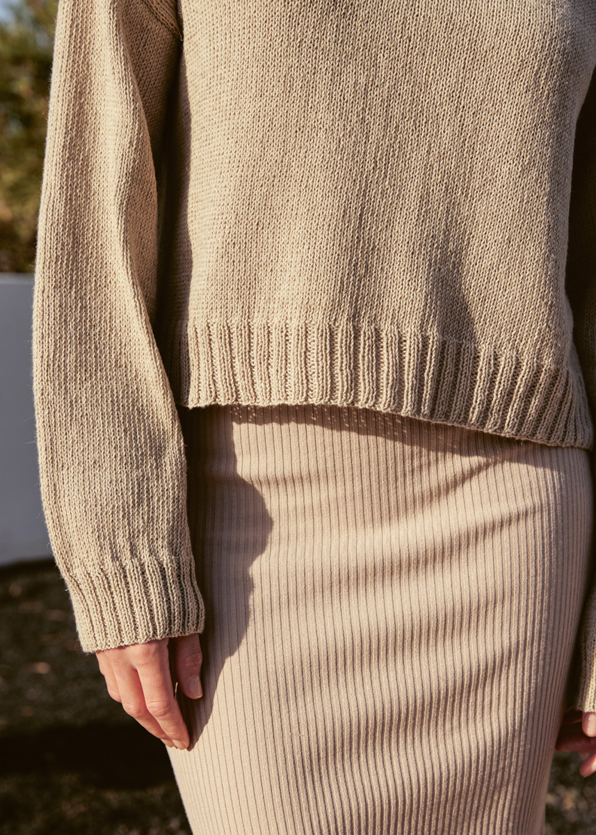 Lana Grossa-kvalitet „Linissimo” (50 % lin, 50 % bomull, löplängd = ca. 187 m/50 g): ca. 350 (400 – 450) g gråbeige (färg 2); stickor nr. 3 och 3,5, 1 rundsticka nr. 3, 50 cm lång.