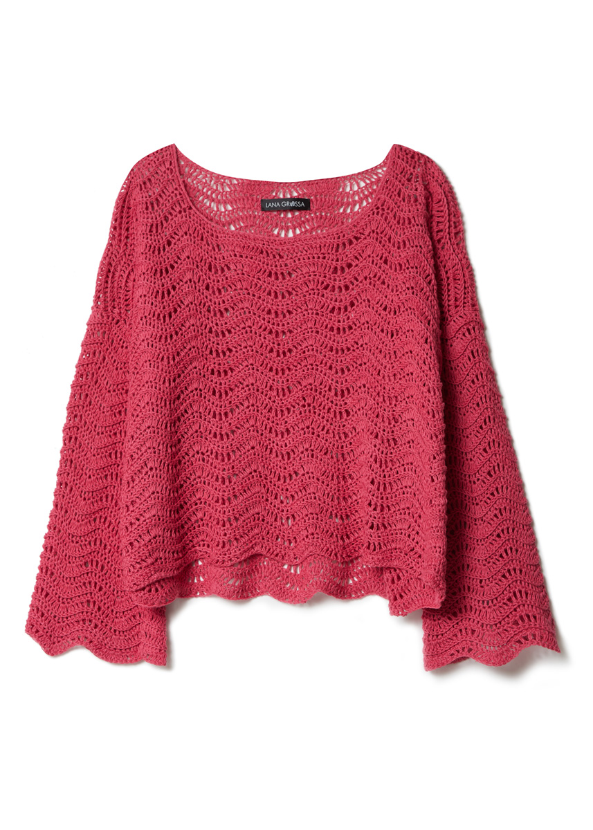 Lana Grossa Linissimo (50% bomull, 50% lin, löplängd 187 m/50 g), 350 (400 – 450 – 500) g jordgubbsröd (färg 6); 1 virknål nr. 4.