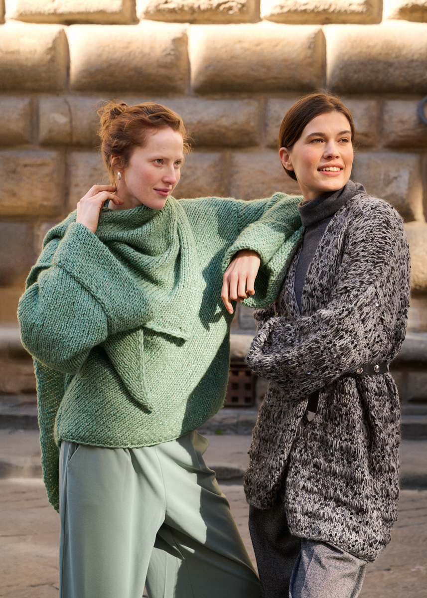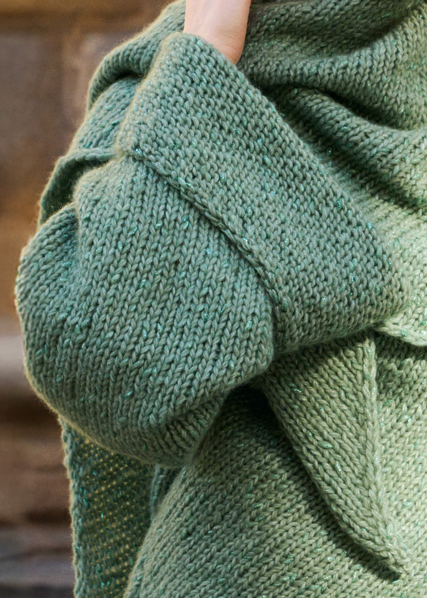Garn: Lana Grossa «Lucciola» (29 % polyamid, 24 % ren ull (merino fine), 22 % viskose, 20 % alpakka (baby), 5 % metallfibre, LL = ca. 130 m/50 g): Ca. 600 (650 - 700 - 750) g grønn (frg 3). Pinner/heklenål: