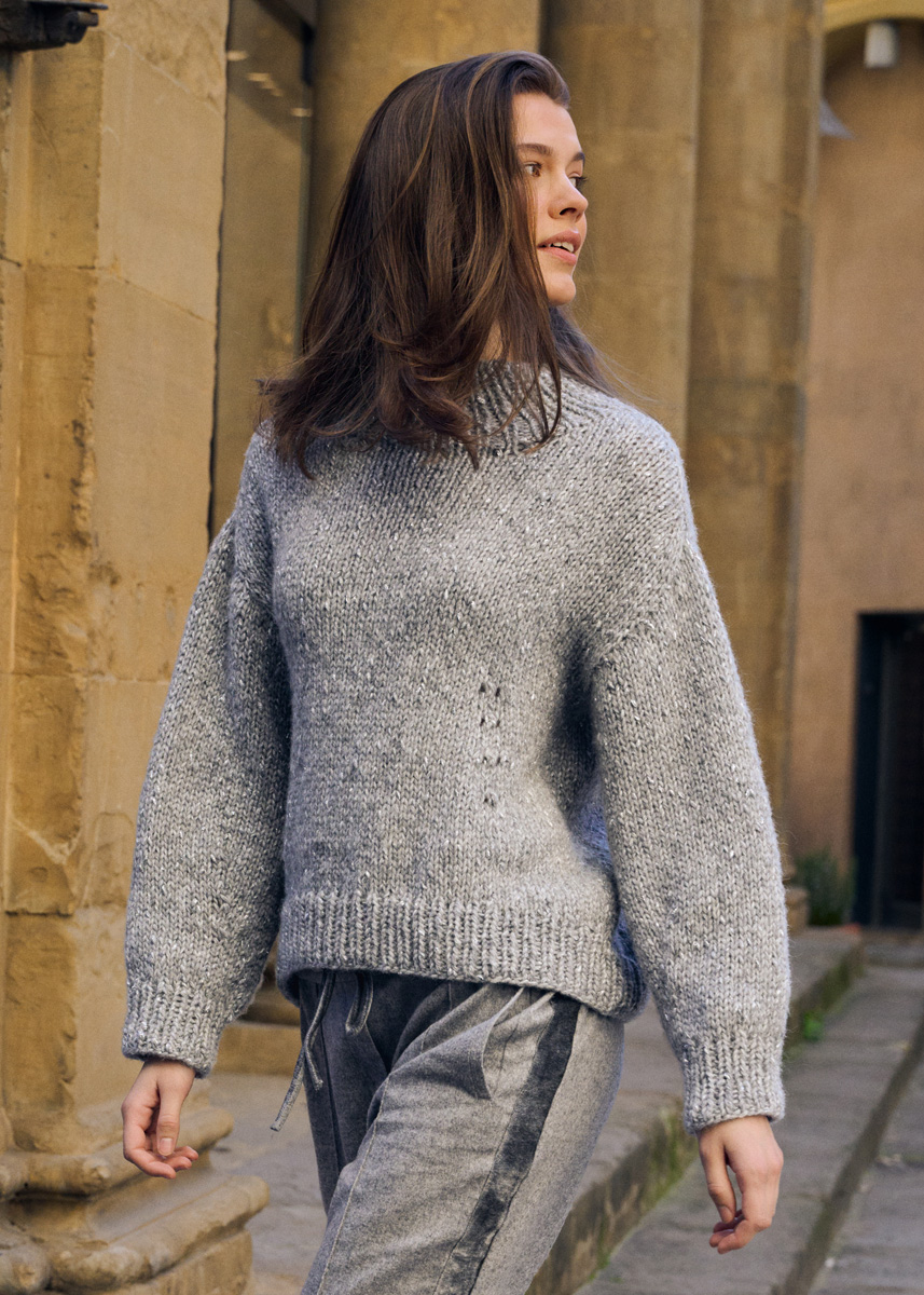 Genseren blir strikket i ett stykke ovenfra og ned med dobbel tråd.