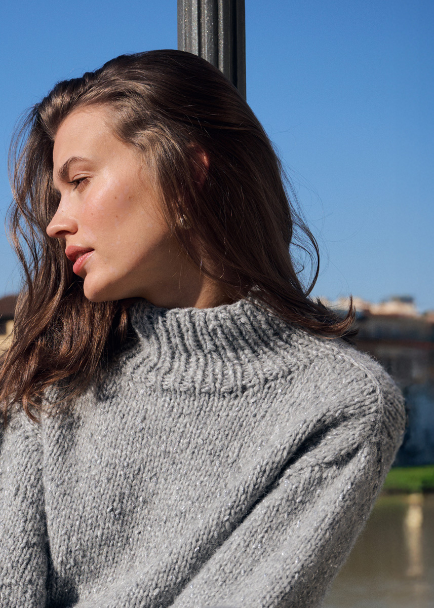 Lana Grossa «Lucciola» (29 % polyamid, 24 % ren ull (merino fine), 22 % viskose, 20 % alpakka (baby), 5 % metallfibre, LL = ca. 130 m/50 g): Ca. 550 (600 - 650 - 700) g grå (frg 2).
