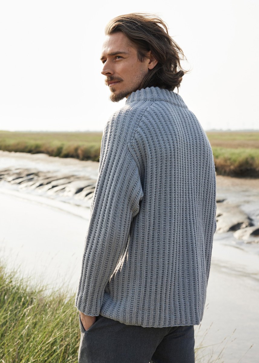 Garn: Cool Wool Big fra Lana Grossa (100% ren ull (merino ekstra fin), LL ca. 120 m/50 g), 750 (800 - 850) g mellomgrå (frg 928) Pinner: Lang rundp nr. 4 og 4,5, en hjelpep