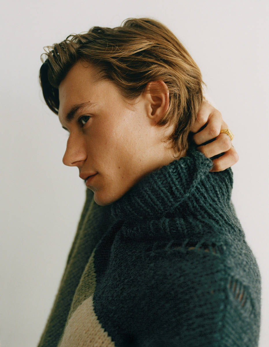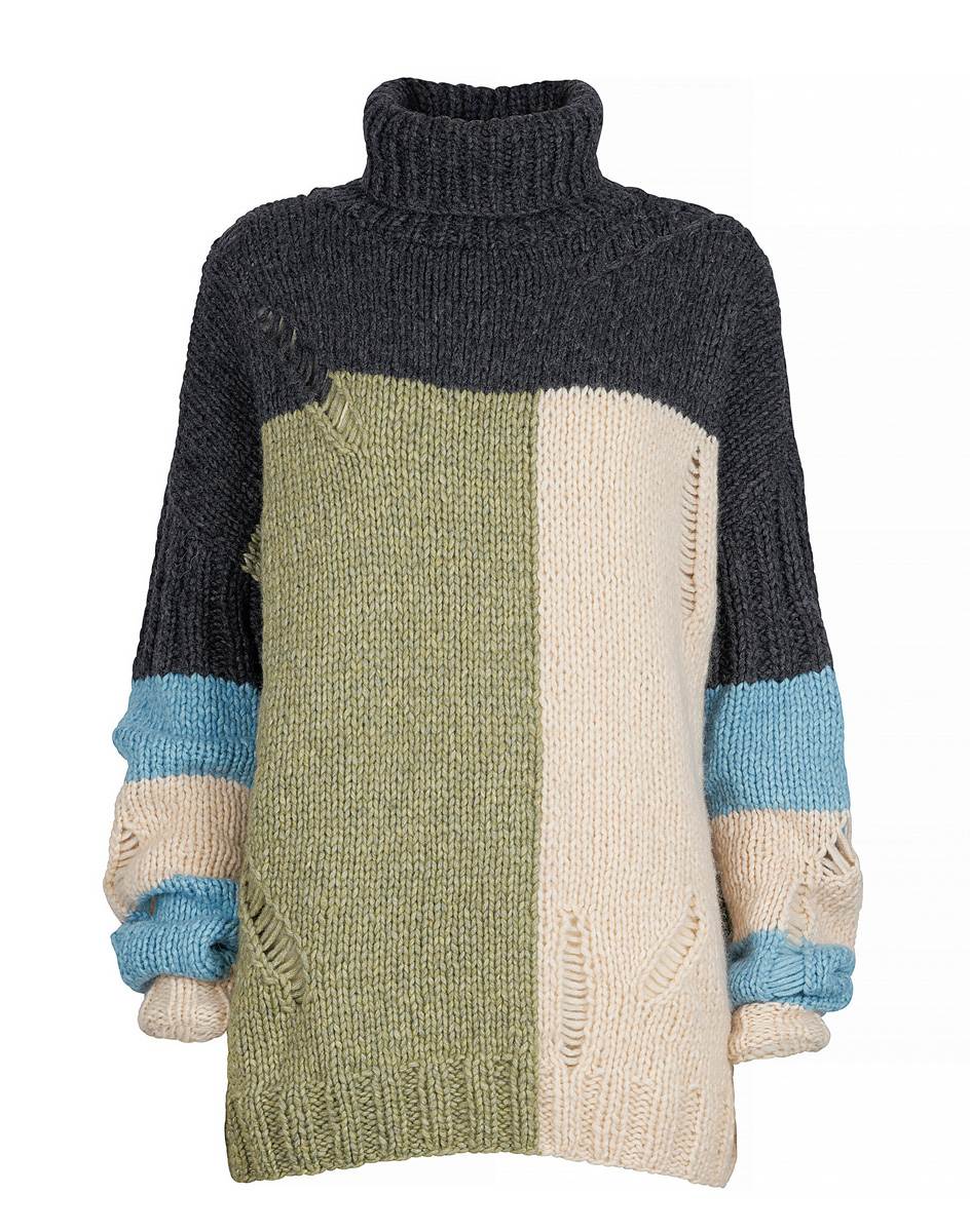 Lana Grossa-kvalitet „Lala Berlin Lovely Cotton“ (75 % ren ny ull (merino superfine), 25 % bomull, löplängd 90 m/50 g): ca. 300 g oliv (färg 3), ca. 200 g natur (färg 7), ca. 150 g anthracit (färg 8) och ca. 100 g blå (färg 1); stickor nr. 7 och 8, 1 rundsticka nr. 7, 50 cm lång.