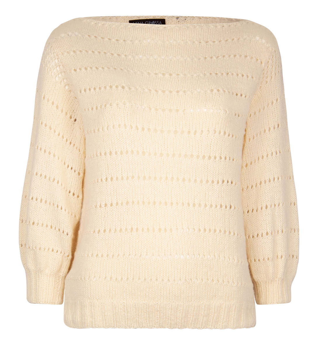 Lana Grossa-kvalitet „Ecopuno” (72 % bomull, 17 % ren ny ull (merino), 11 % (baby) alpacka, löplängd = ca. 215 m/50 g): ca. 250 (300) g ecru (färg 46); stickor nr. 3,5 och 4,5.