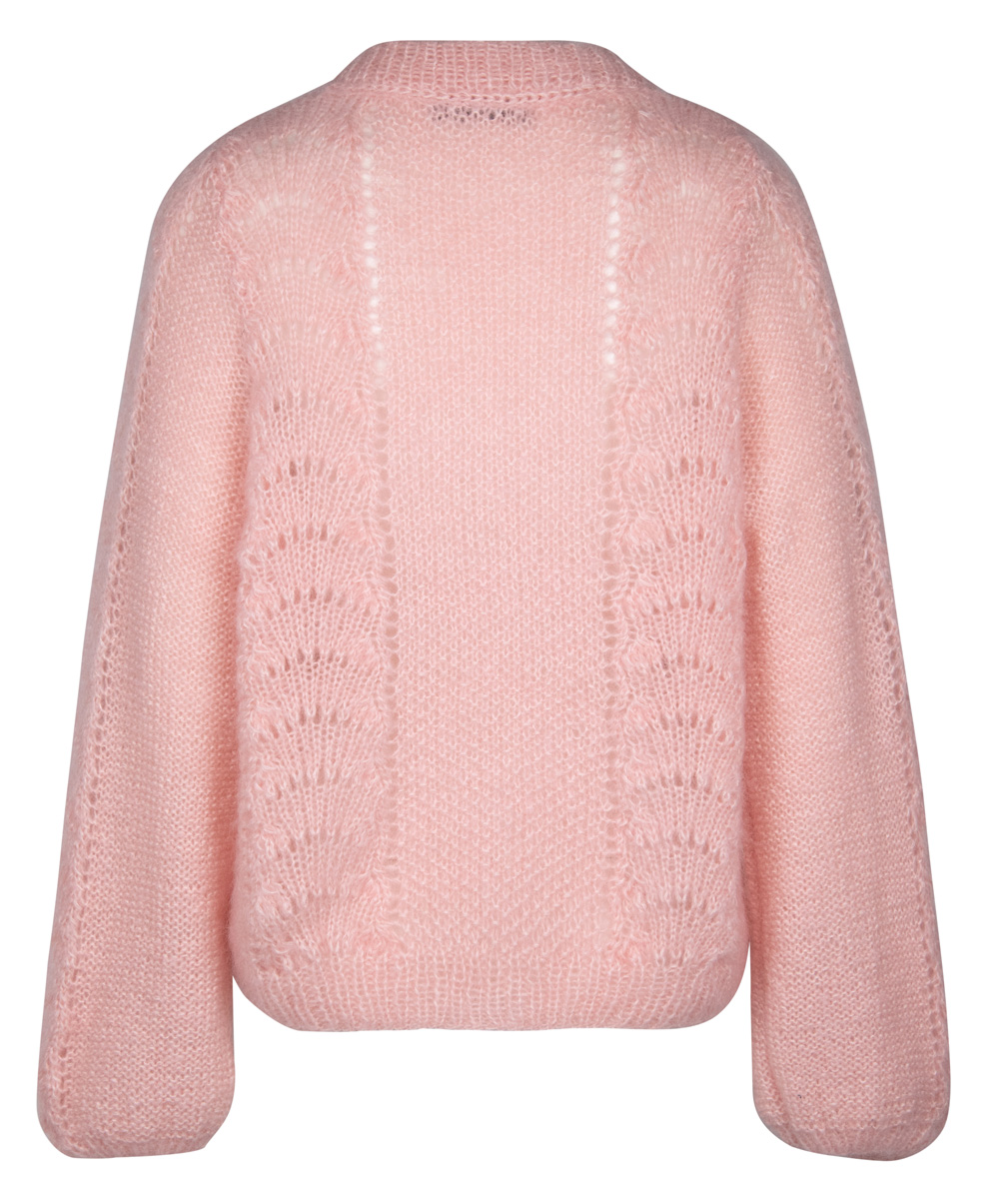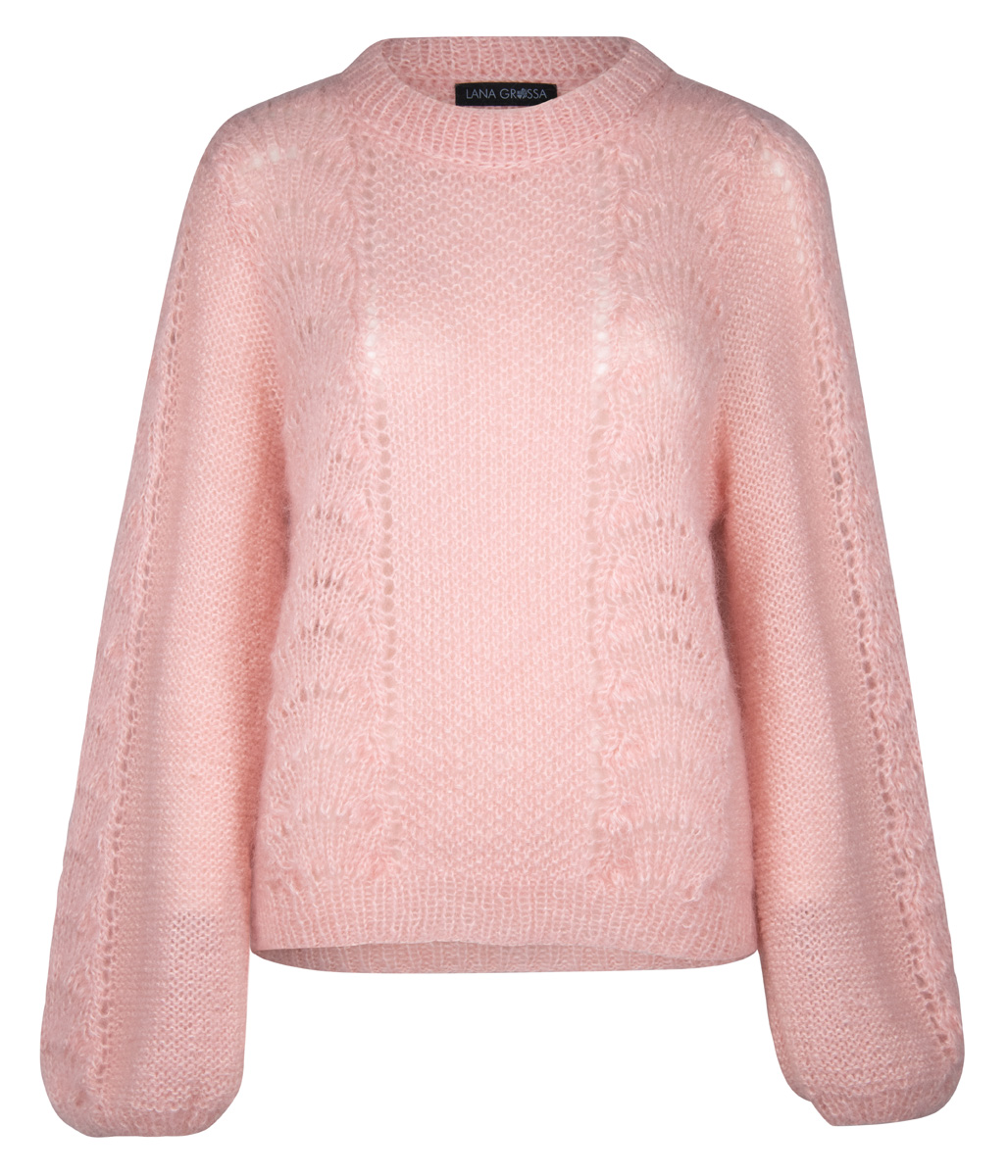 Lana Grossa-kvalitet „Silkhair” (70 % mohair (superkid), 30 % silke, löplängd = ca. 210 m/25 g): ca. 325 (350) g puderrosa (färg 86); stickor nr. 5 och 6, 1 rundsticka nr. 5, 50 cm lång, 1 ullvirknål nr. 5.