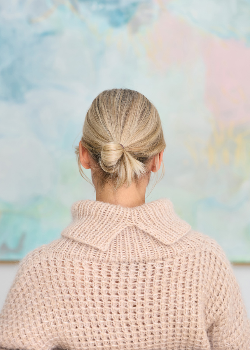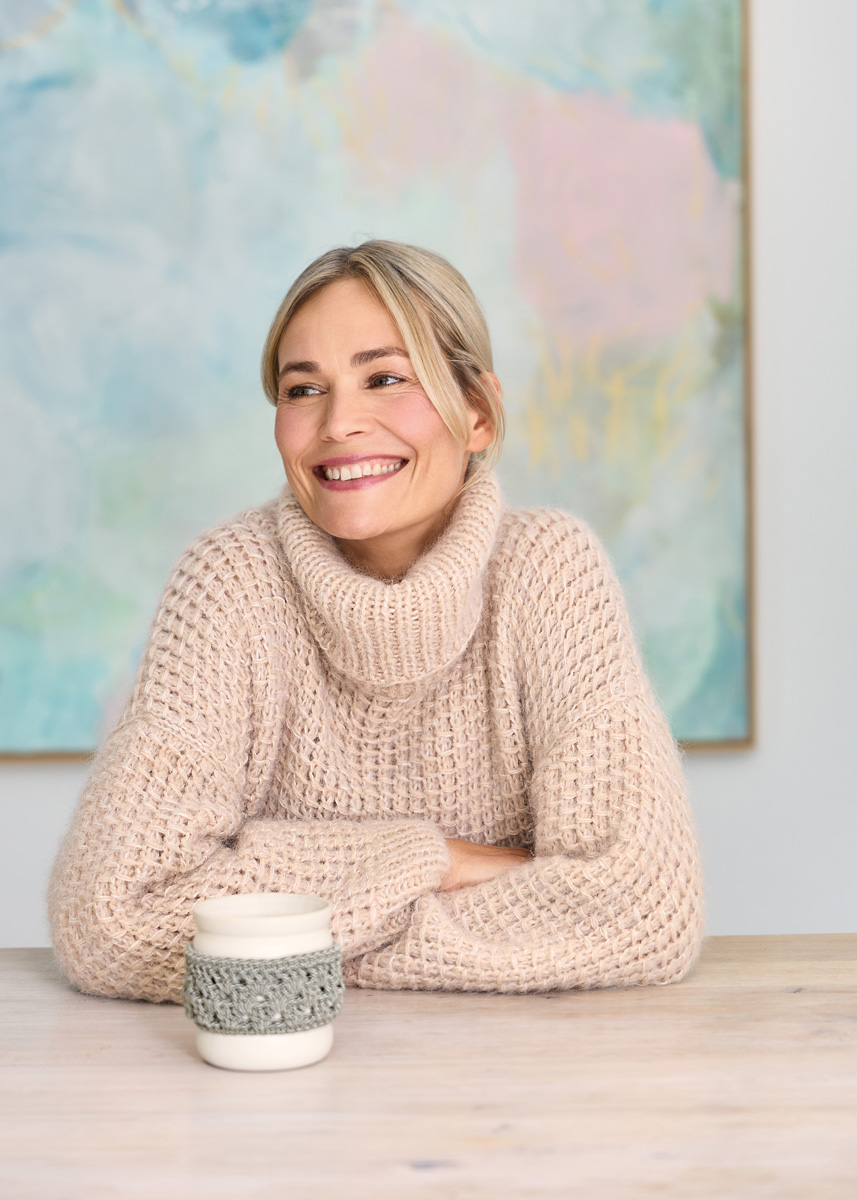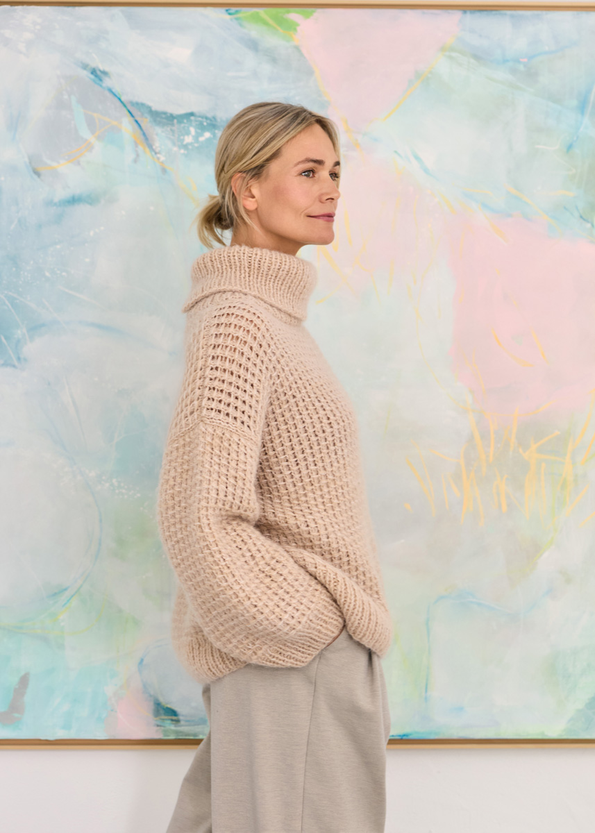 Lana Grossa-kvalitet „Nebbia” (55 % ren ny ull (merino extrafine), 45 % (baby) alpakka, løpelengde = ca. 170 m/50 g): ca. 350 (400 – 450) g beige (farge 13) og Lana Grossa-kvalitet „Silkhair” (70 % mohair (Superkid), 30 % silke, løpelengde = ca. 210 m/25 g): ca. 250 (275 – 300) g lysbeige (farge 18); pinner nr. 6,5 og 7, 1 rundpinne nr. 7, 50 cm lang. Merknad: Hele arbeidet strikkes med tredobbel tråd: 1 tråd Nebbia og 2 tråder Silkhair!