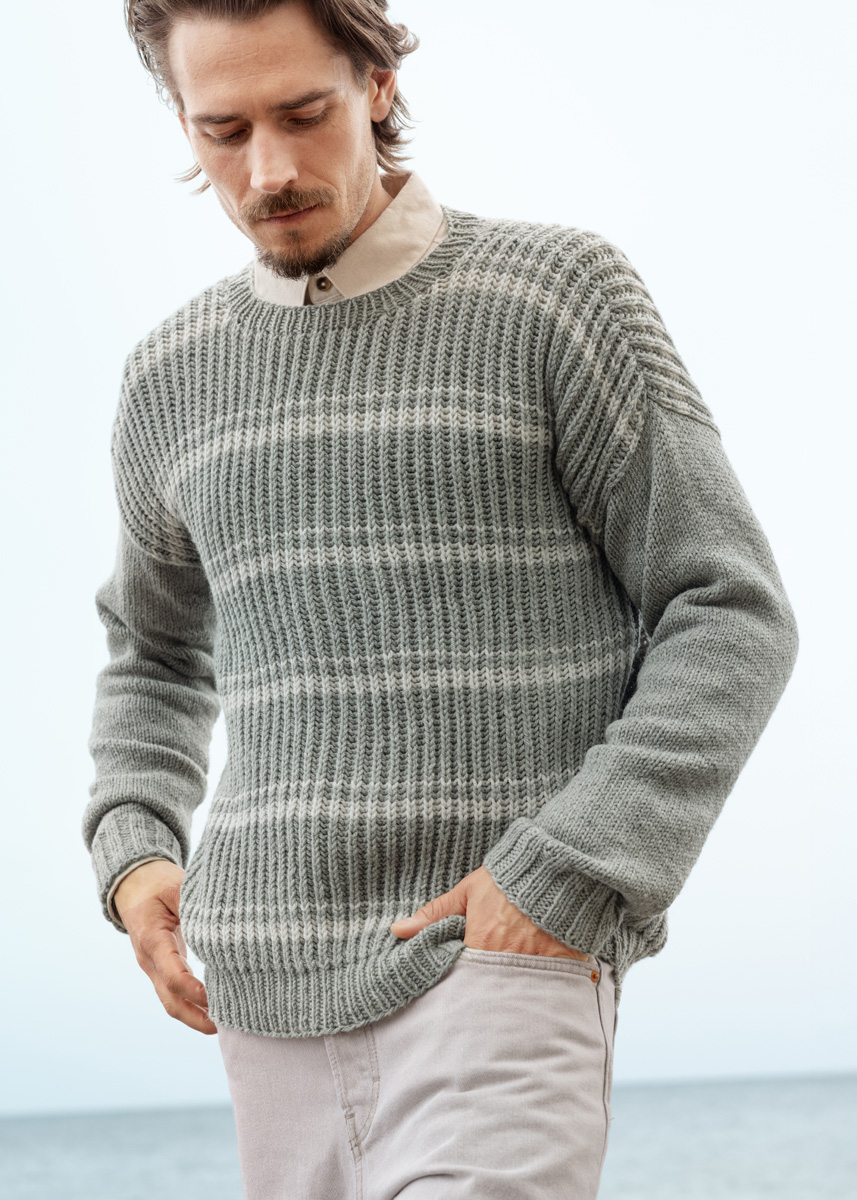 Lana Grossa Merino Uno (100% ren ny ull (merino superwash) løpelengde 125 m/50 g), 500 (550 – 600) g gråbeige (farge 74) og 100 g lysgrå (farge 10); strikkepinner nr. 5,5 og 6, såvel som 1 rundpinne nr. 5,5, 40 cm lang.