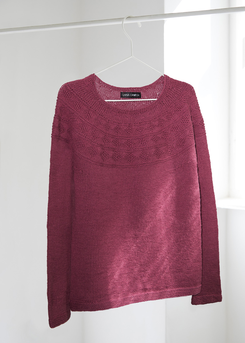 Lana Grossa-kvalitet „Merino Uno“ (100 % ren ny uld (merino), løbelængde = ca. 125 m / 50 gr.): 400(450-450- 500-550) gr lilla (fv 69) eller mauve (fv 17), rundpinde af forskellig længde, nr. 4 og 4½.