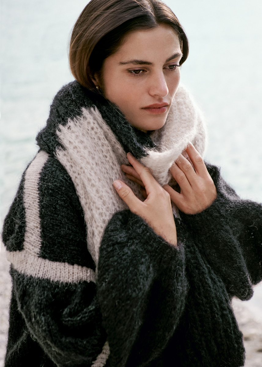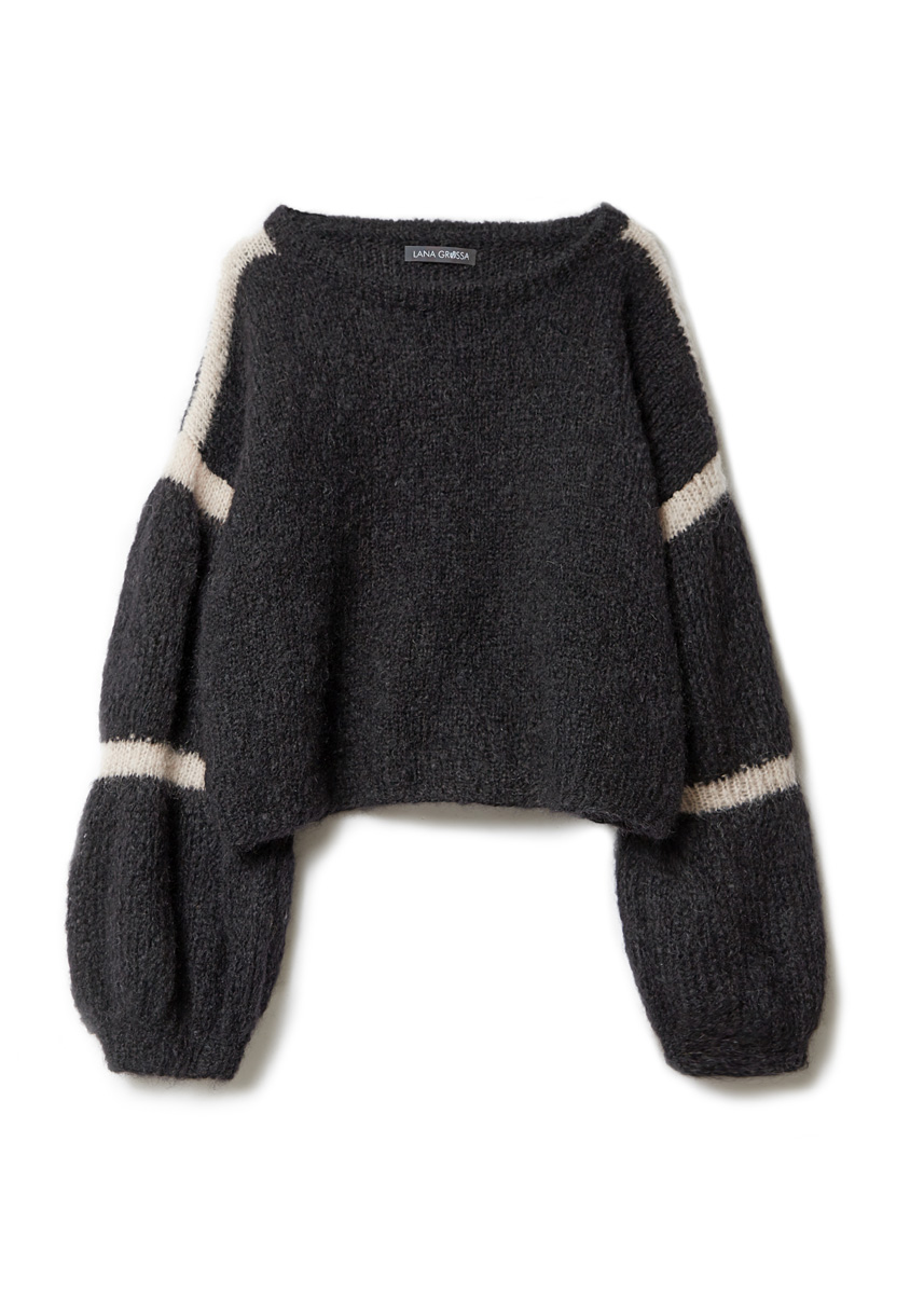 Lana Grossa „Mohair Moda“ (70% mohair (kid mohair), 20% ren ny ull (merino superfine) 10% polyamid, löplängd = 140 m/50 g): 300 (350 - 400) g i svart (färg 16) och 50 g i beige (färg 11); stickor nr. 4,5, nr. 5,5 och nr. 9, 1 rundsticka nr. 4,5, 50 cm lång.