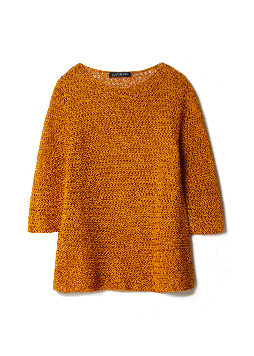 Lana Grossa-kvalitet „Nastrino“ (100 % bomull, löplängd = ca. 190 m/50 g): ca. 250 (250-300) g i ginstgul (färg 11); stickor nr. 3,5, 1 rundsticka nr. 3,5, 50 cm lång.