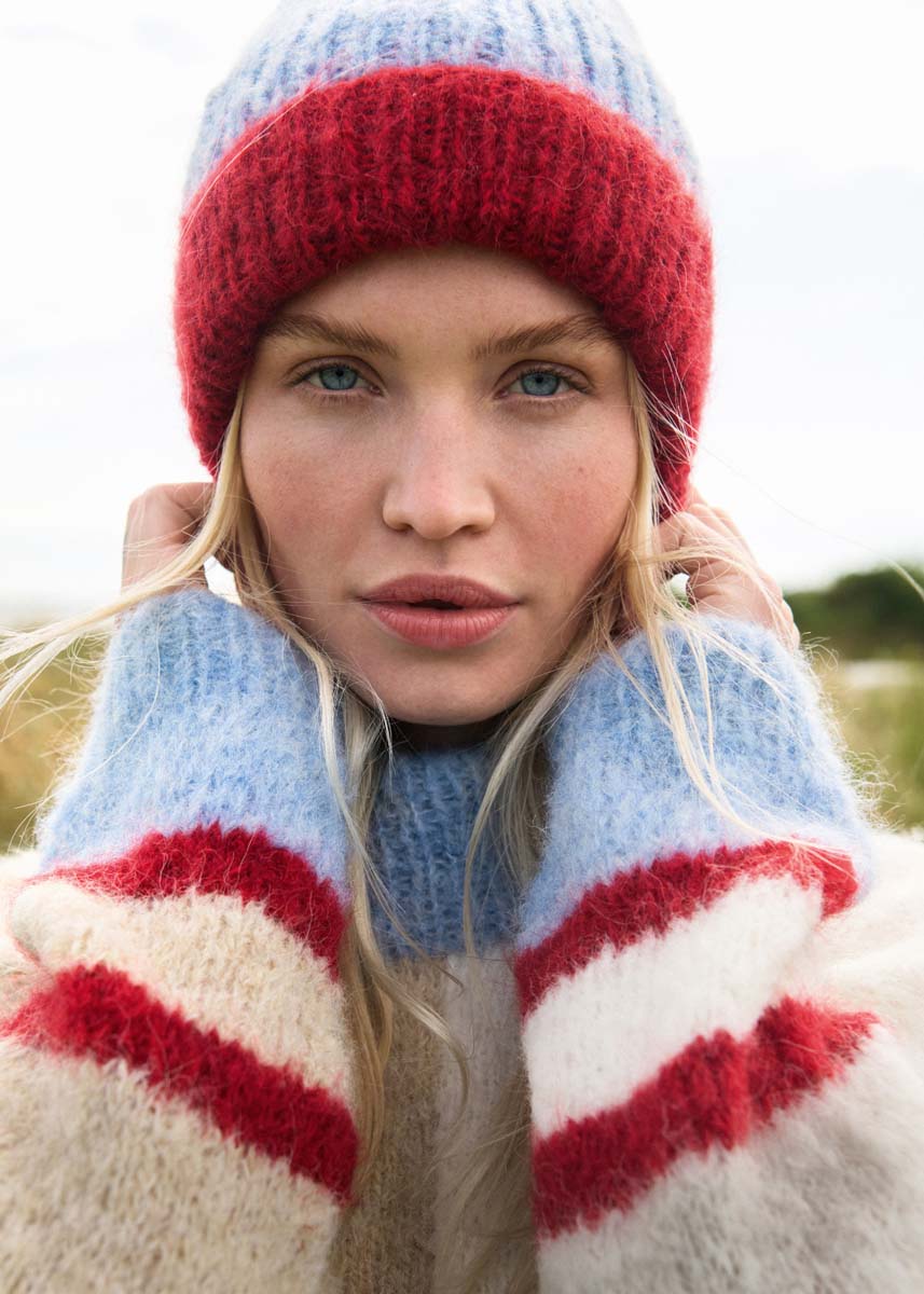 Garn: Lana Grossa Natural Alpaca Lungo (89 % alpakka (baby), 11 % polyamid, LL = 190 m/50 g): 150 (150/200/200) g natur (farge nr. 1) og beige (farge nr. 02) og 50 g lys blå (farge nr. 6) og rød (farge nr. 12)