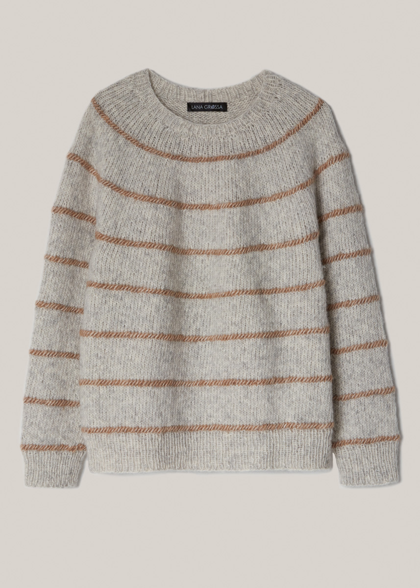 Lana Grossa-kvalitet „Natural Alpaca Pelo” (63 % bomull, 31 % (baby) alpacka, 6 % ren ny ull (merino), löplängd = ca. 125 m/50 g) ca. 350 (400) g råvit/mjukgrå (färg 2) och ca. 100 g kamel/Beige (färg 7); rundstickor nr. 3,5, 40 och 80 cm lång, rundstickor nr. 4,5, 50, 80 och 120 cm lång, strumpstickor nr. 3,5 och 4,5.