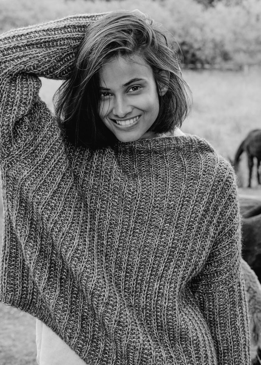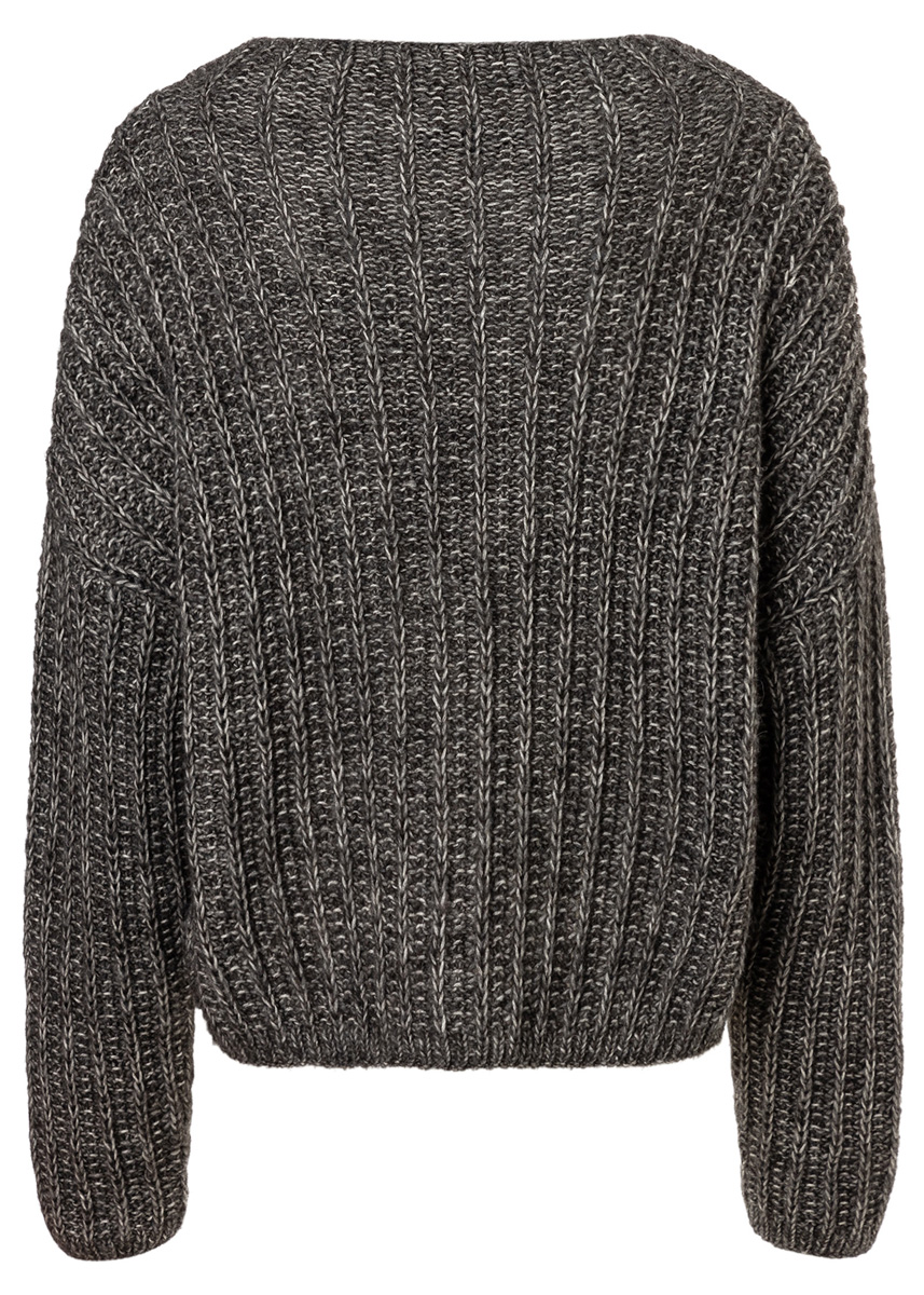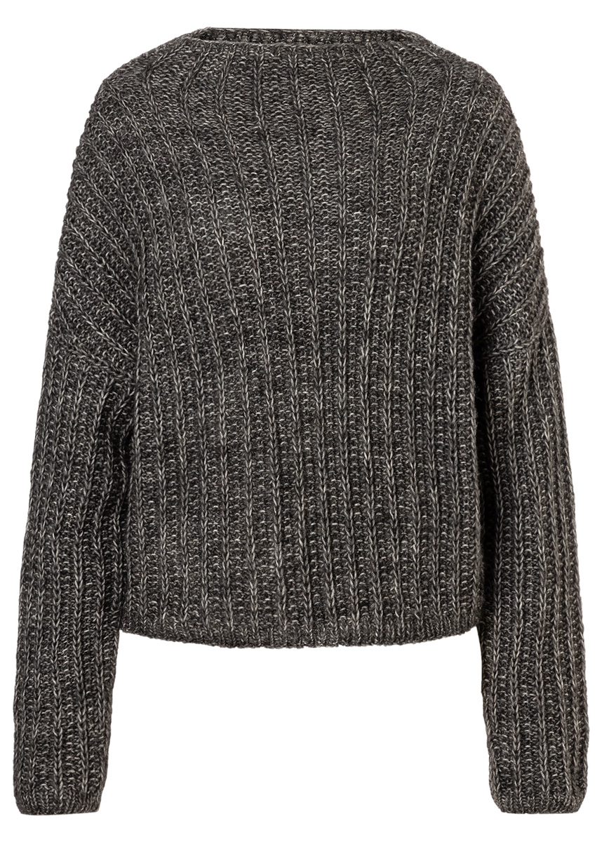 Lana Grossa-kvalitet „Natural Alpaca Pelo” (63 % bomull, 31 % (baby) alpacka, 6 % ren ny ull (merino), löplängd = ca. 125 m/50 g): ca. 450 (500 - 550) g mörk grå melerad (färg 4); stickor nr. 4 och nr. 5.
