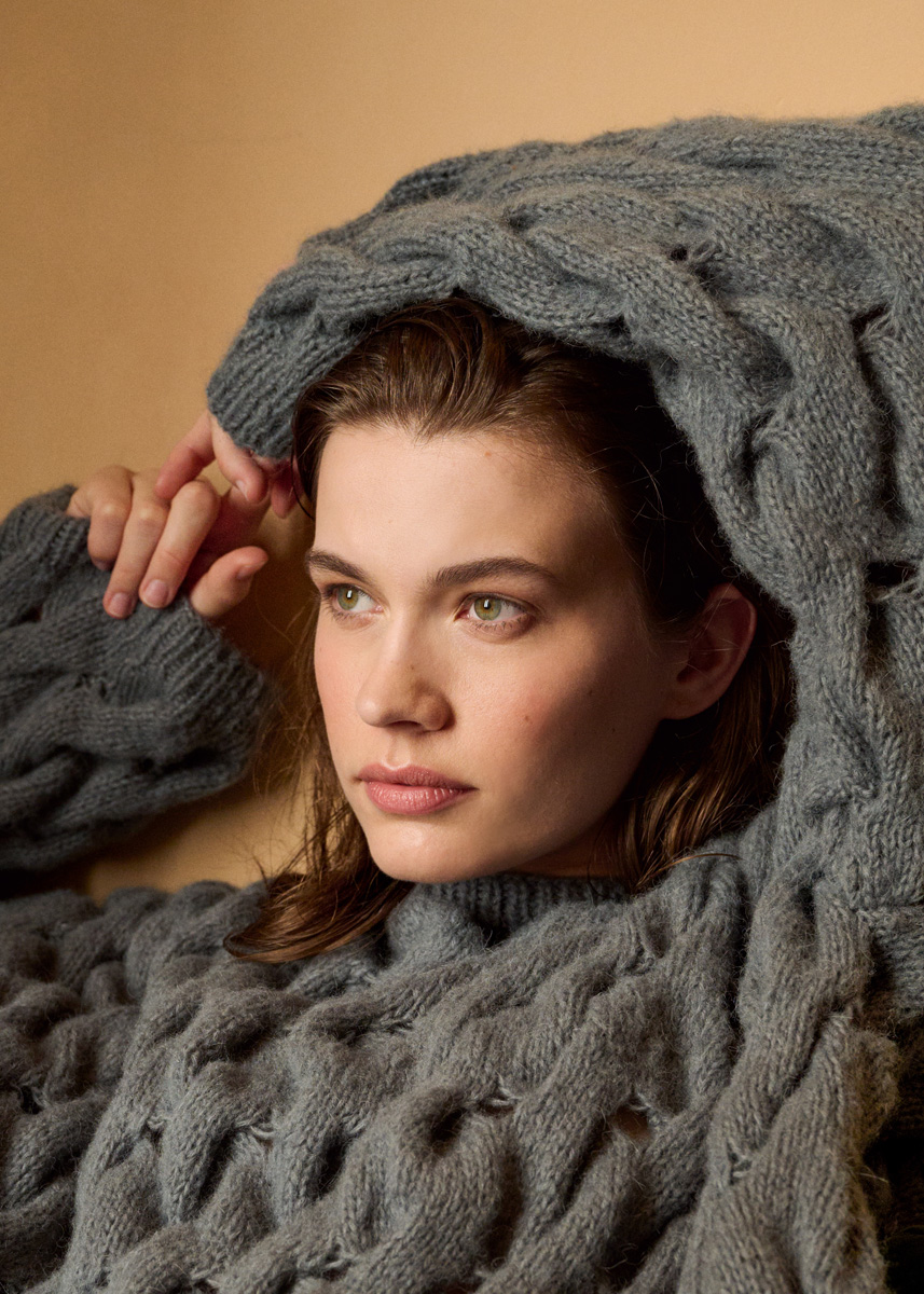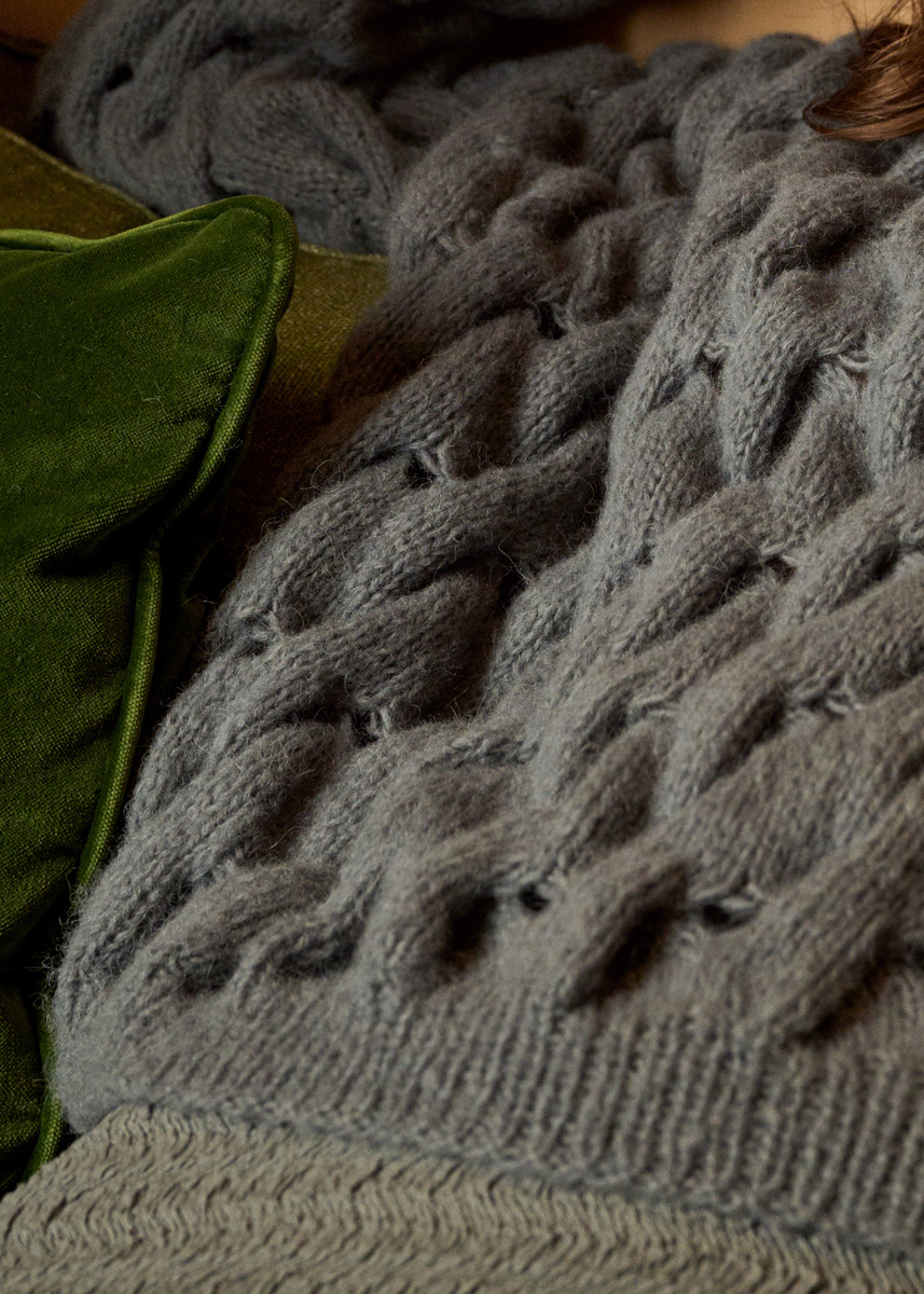 Garn: Lana Grossa «Nebbia» (55 % ren ull (merino extrafine), 45 % alpakka (baby), LL = ca. 170 m/50 g): 500 (550 - 600) g mørk grå (frg 7).