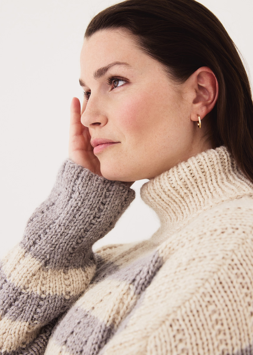 Lana Grossa New Classic (48% ren ny ull (merino), 36% viskos (bambu), 8% jak, 8% nylon, löplängd 100 m/50 g), 250 (300 – 350 – 400) g grå (färg 11) och 250 (300 – 350 – 400) g creme (färg 18) och Lana Grossa Setasuri (69% Alpacka (Suri), 31% silke, löplängd 212 m/25 g), 50 (75 – 100 – 100) g ljusgrå (färg 19) och 50 (75 – 100 – 100) g creme (färg 2); stickor nr. 7 och 1 rundsticka nr. 6, 40 cm lång. OBS: Modellen stickas med dubbla trådar, 1 tråd var av New Classic och Setasuri!