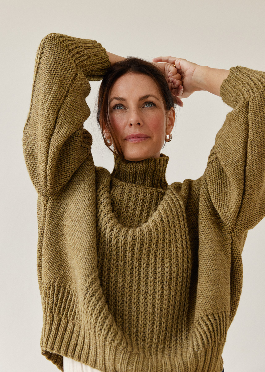 Lana Grossa New Classic (48% ren ny ull (merino), 36% viskos (bambu), 8% jak, 8% nylon, löplängd 100 m/50 g), 650 (700 – 750) g oliv (färg 8); stickor nr. 5 och 7, samt 1 rundsticka nr. 5, 40 cm lång.