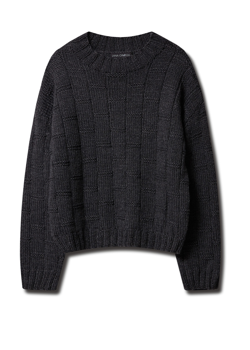 Lana Grossa New Classic (48% ren ny ull (merino), 36% viskos (bambu), 8% Yak, 8% nylon, löplängd 100 m/50 g), 550 (600 – 650) g anthracit (färg 12); stickor nr. 4,5 och 6, samt 1 rundsticka nr. 4,5, 40 cm lång.