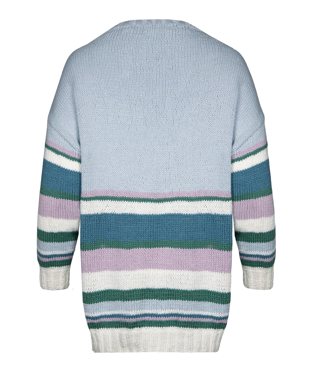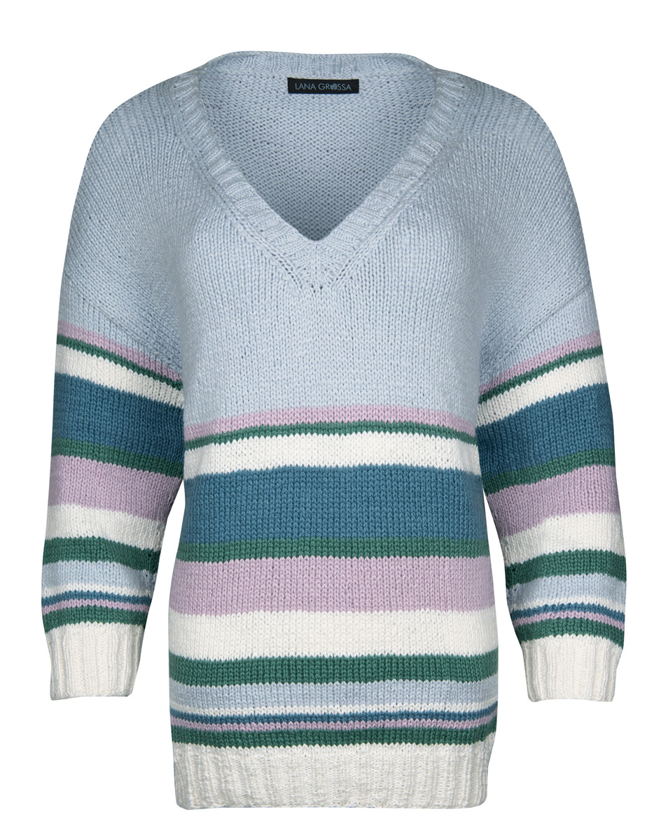 Lana Grossa-kvalitet „Organico“ (100 % bomull, löplängd = ca. 90 m / 50 gr.): ca. 200(250) gr ljus grå (färg 29), ca. 150 gr ecru (färg 6), 100 gr resedagrön (färg 116), 100 gr mörk petrol (färg 79) och 100 gr violet (färg 97), stickor nr. 3½ och 4½, rundsticka nr. 3, 60 cm.