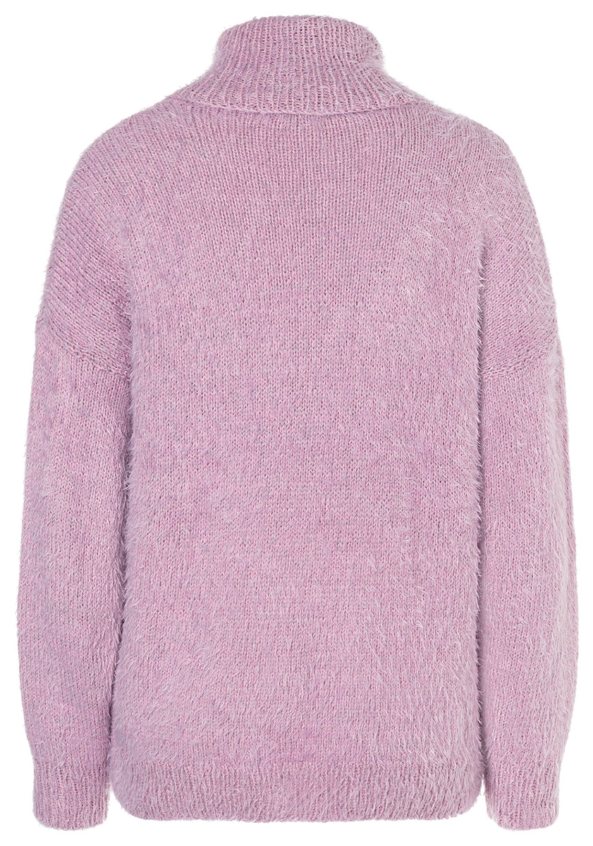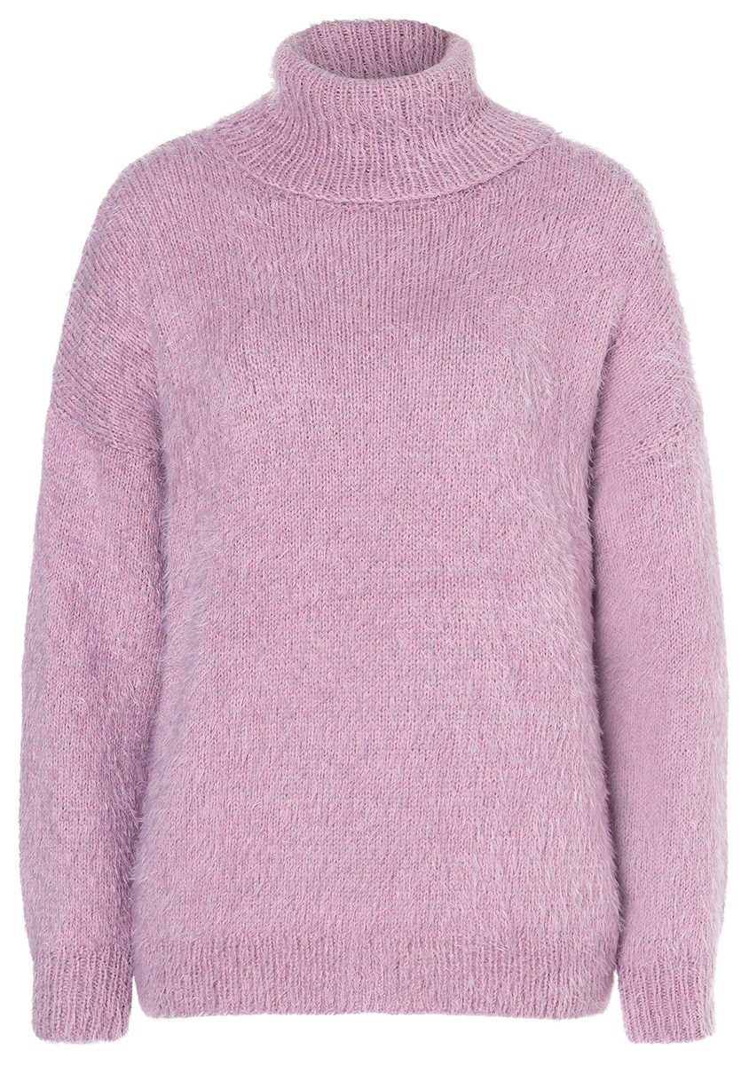 Lana Grossa Per Fortuna (74% bio bomull, 26% polyamid, löplängd 190 m/50 g), 450 (500 – 550) g syren (färg 5) och Lana Grossa Cool Wool Lace (100% ren ny ull merino, löplängd 400 m/50 g), 200 (250 – 250) g syren (färg 15); stickor nr. 4 och 4, 5, 1 rundsticka nr. 4, 5, 40 cm lång.