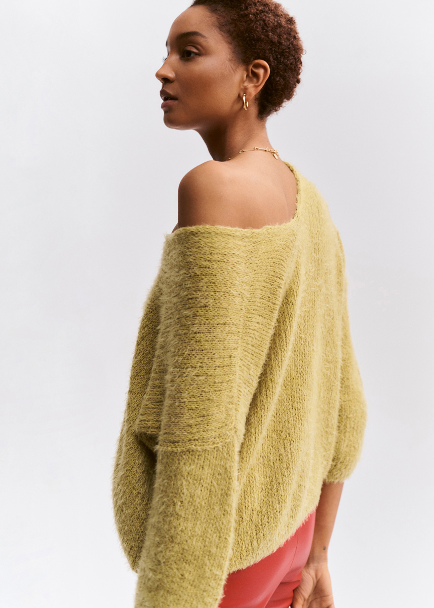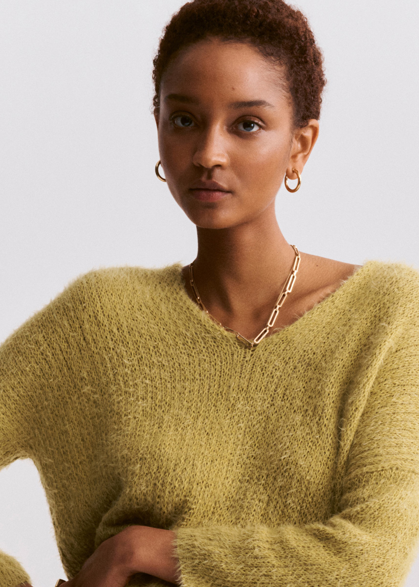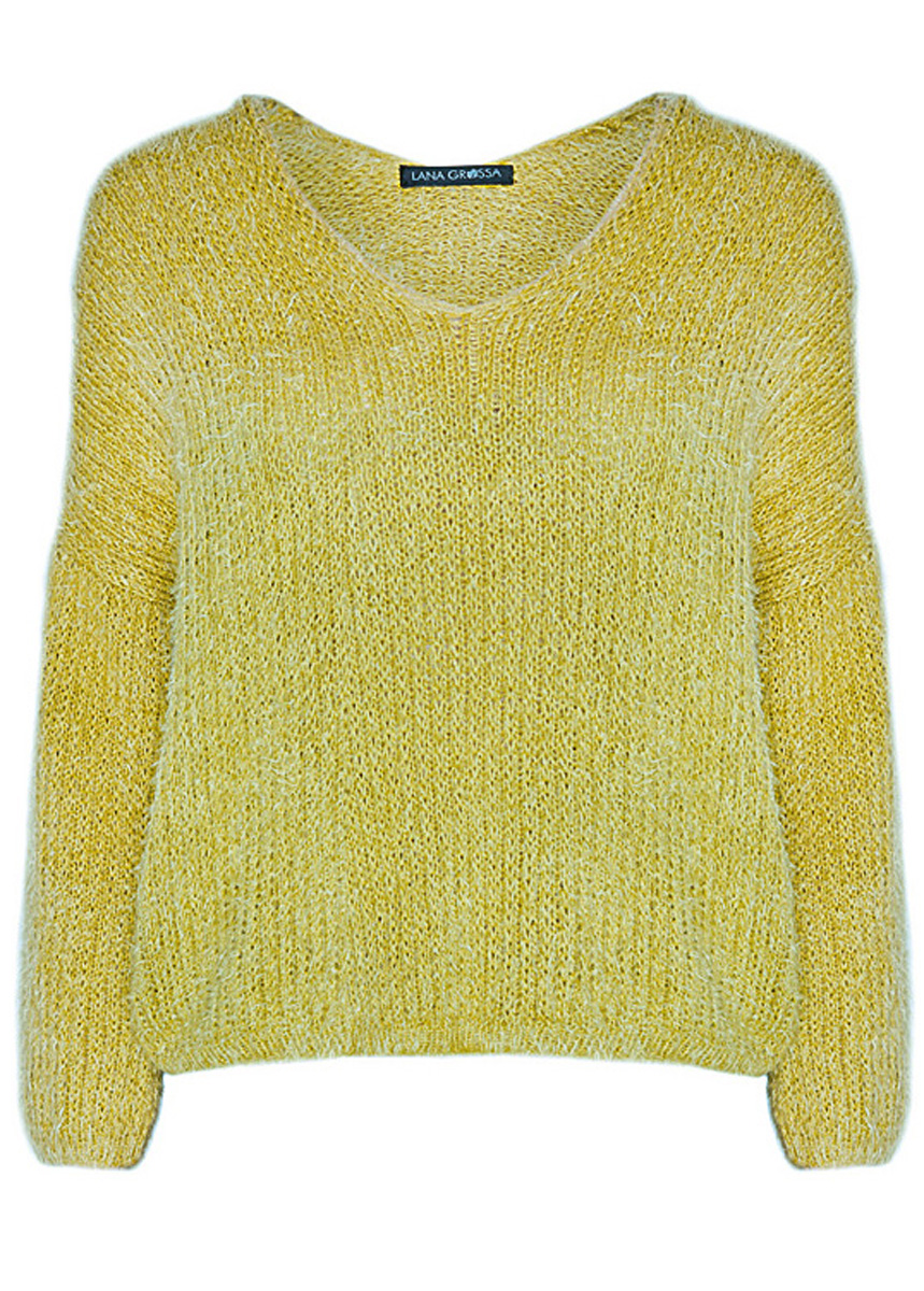 Lana Grossa-kvalitet „Per Fortuna“ (74 % bio bomull, 26 % polyamid, löplängd 190 m/50 g): ca. 300 (350 – 400) g senap (färg 13); stickor nr. 3 och 6.